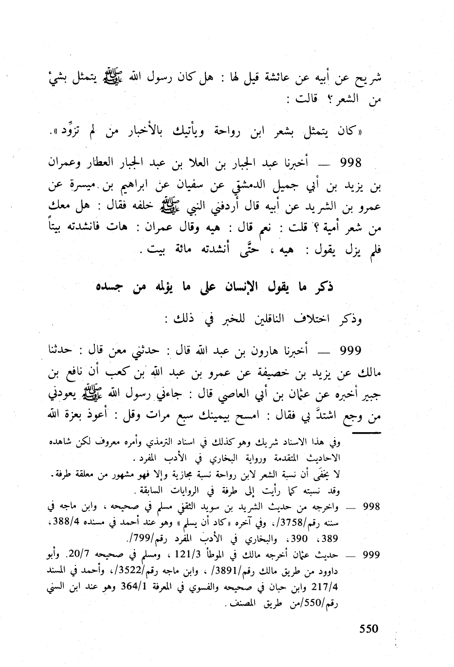 998 - أخبرنَا عبد الْجَبَّار بن الْعلَا بن عبد الْجَبَّار الْعَطَّار وَعمْرَان بن يزِيد بن أبي جميل الدِّمَشْقِي عَن سُفْيَان عَن ابراهيم بن ميسرَة عَن عَمْرو بن الشريد عَن أَبِيه قَالَ أردفني النَّبِي صلى الله عَلَيْهِ وَسلم خَلفه فَقَالَ هَل مَعَك من شعر أُمِّيّه قلت نعم قَالَ هيه وَقَالَ عمرَان هَات فَأَنْشَدته بَيْتا فَلم يزل يَقُول هيه حَتَّى أنشدته مائَة بَيت