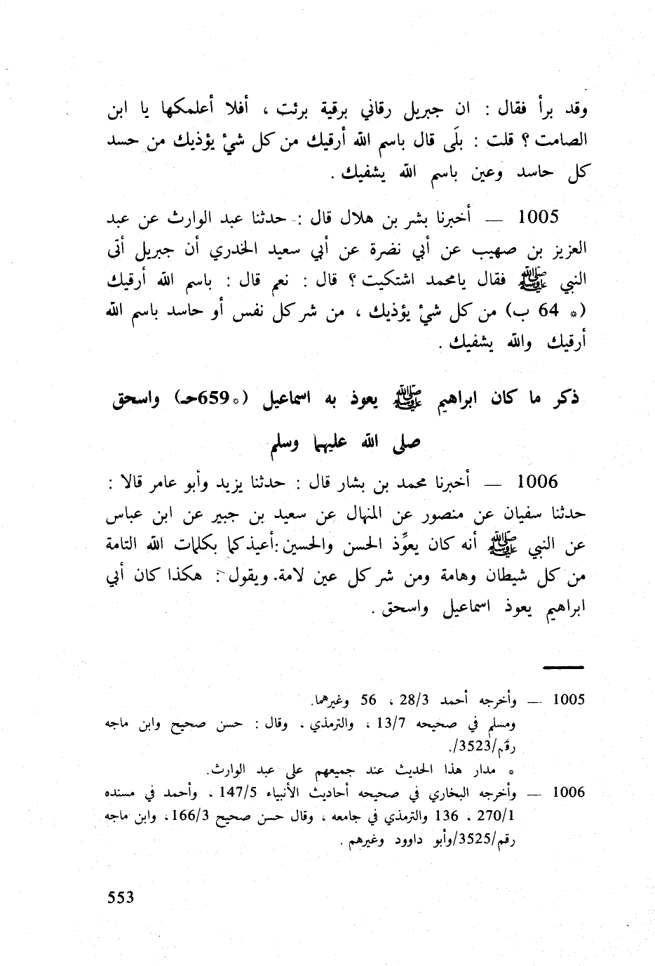ذكر مَا كَانَ إِبْرَاهِيم صلى الله عَلَيْهِ وَسلم يعوذ بِهِ اسماعيل (659 ح) واسحق صلى الله عَلَيْهِمَا وَسلم