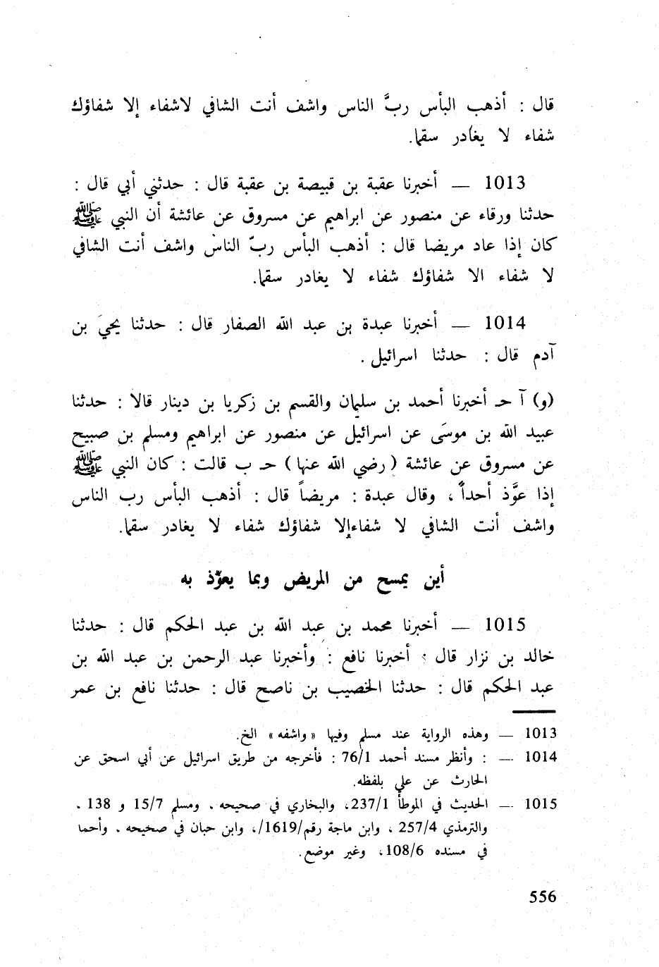 1013 - أخبرنَا عقبَة بن قبيصَة بن عقبَة قَالَ حَدثنِي أبي قَالَ حَدثنَا وَرْقَاء عَن مَنْصُور عَن ابراهيم عَن مَسْرُوق عَن عَائِشَة أَن النَّبِي صلى الله عَلَيْهِ وَسلم كَانَ إِذا عَاد مَرِيضا قَالَ أذهب الْبَأْس رب النَّاس واشف أَنْت الشافي لَا شِفَاء إِلَّا شفاؤك شِفَاء لَا يُغَادر سقما