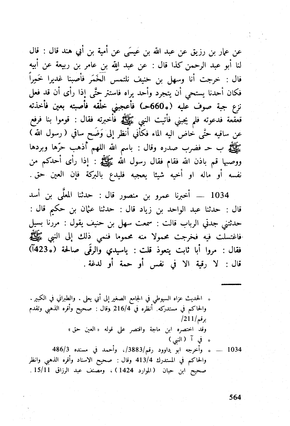 1034 - أخبرنَا عَمْرو بن مَنْصُور قَالَ حَدثنَا الْمُعَلَّى بن أَسد قَالَ حَدثنَا عبد الْوَاحِد بن زِيَاد قَالَ حَدثنَا عُثْمَان بن حَكِيم قَالَ حَدَّثتنِي جدتي الربَاب قَالَت سَمِعت سهل بن حنيف يَقُول مَرَرْنَا بسيل فاغتسلت فِيهِ فَخرجت مَحْمُولا مِنْهُ محموماً فنمي ذَلِك إِلَى النَّبِي صلى الله عَلَيْهِ وَسلم فَقَالَ مروا أَبَا ثَابت يتقوذ قلت يَا سَيِّدي والرقى صَالِحَة (423 آ) قَالَ