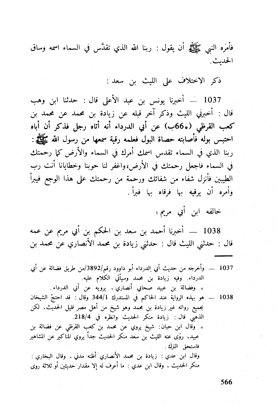 1037 - أخبرنَا يُونُس بن عبد الْأَعْلَى قَالَ حَدثنَا ابْن وهب قَالَ أَخْبرنِي اللَّيْث وَذكر آخر قبله عَن زِيَادَة بن مُحَمَّد عَن مُحَمَّد بن كَعْب الْقرظِيّ (66 ب) عَن أبي الدَّرْدَاء أَنه أَتَاهُ رجل فَذكر أَن أَبَاهُ احْتبسَ بَوْله فأصابته حَصَاة الْبَوْل فَعلمه رقية سَمعهَا من رَسُول الله صلى الله عَلَيْهِ وَسلم