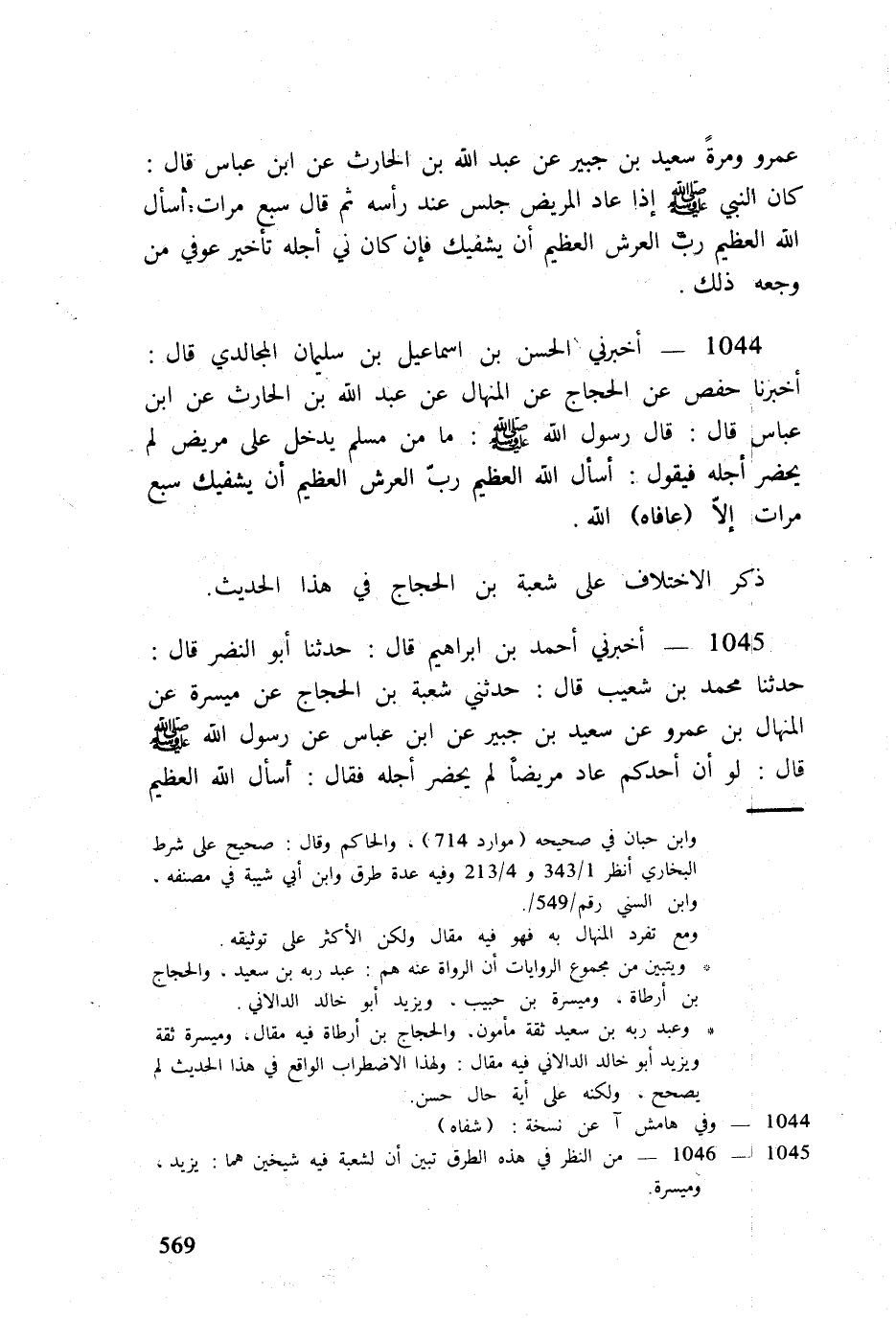 1045 - أَخْبرنِي أَحْمد بن ابراهيم قَالَ حَدثنَا أَبُو النَّضر قَالَ حَدثنَا مُحَمَّد بن شُعَيْب قَالَ حَدثنِي شُعْبَة بن الْحجَّاج عَن ميسرَة عَن الْمنْهَال بن عَمْرو عَن سعيد بن جُبَير عَن ابْن عَبَّاس عَن رَسُول الله صلى الله عَلَيْهِ وَسلم قَالَ