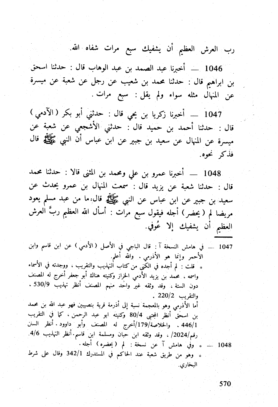 1046 - أخبرنَا عبد الصَّمد بن عبد الْوَهَّاب قَالَ حَدثنَا اسحق بن ابراهيم قَالَ حَدثنَا مُحَمَّد بن شُعَيْب عَن رجل عَن شُعْبَة عَن ميسرَة عَن الْمنْهَال مثله سَوَاء وَلم يقل سبع مَرَّات
