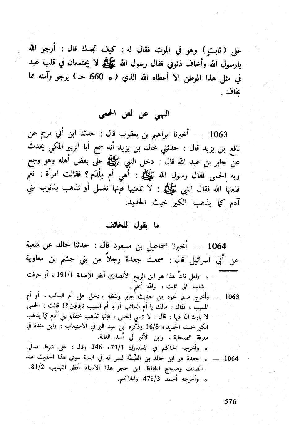 1063 - أخبرنَا ابراهيم بن يَعْقُوب قَالَ حَدثنَا ابْن أبي مَرْيَم عَن نَافِع بن يزِيد قَالَ حَدثنِي خَالِد بن يزِيد أَنه سمع أَبَا الزبير الْمَكِّيّ يحدث عَن جَابر بن عبد الله قَالَ دخل النَّبِي صلى الله عَلَيْهِ وَسلم على بعض أَهله وَهُوَ وجع وَبِه الْحمى فَقَالَ رَسُول الله صلى الله عَلَيْهِ وَسلم