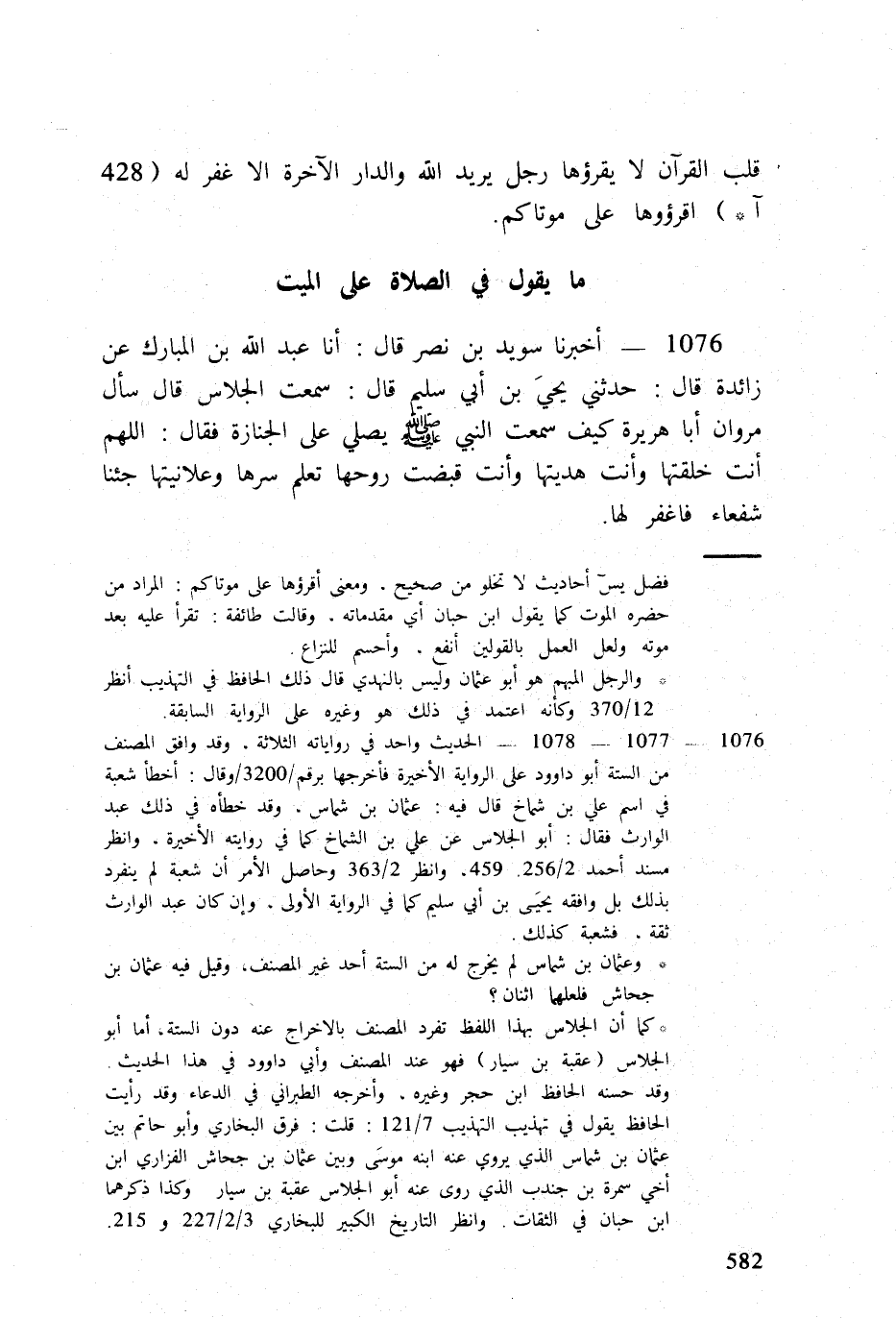 1076 - أخبرنَا سُوَيْد بن نصر قَالَ أَنا عبد الله بن الْمُبَارك عَن زَائِدَة قَالَ حَدثنِي يحي بن أبي سليم قَالَ سَمِعت الْجلاس قَالَ سَأَلَ مَرْوَان أَبَا هُرَيْرَة كَيفَ سَمِعت النَّبِي صلى الله عَلَيْهِ وَسلم يُصَلِّي على الْجِنَازَة فَقَالَ اللَّهُمَّ أَنْت خلقتها وَأَنت هديتها وَأَنت قبضت روحها تعلم سرها وعلانيتها جِئْنَا شُفَعَاء فَاغْفِر لَهَا