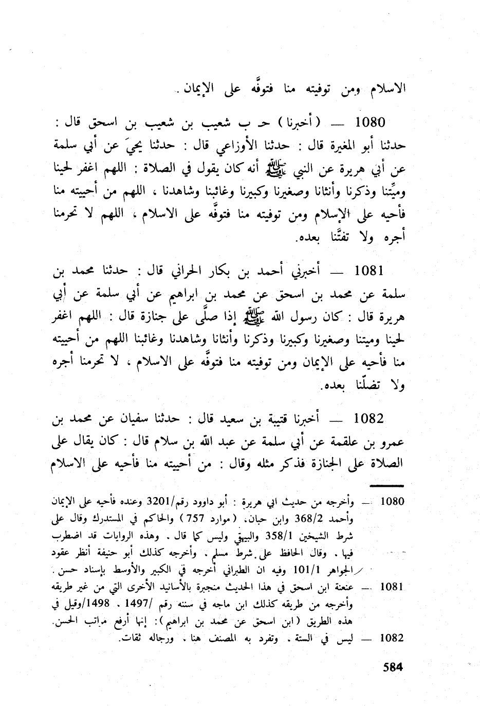 1082 - أخبرنَا قُتَيْبَة بن سعيد قَالَ حَدثنَا سُفْيَان عَن مُحَمَّد بن عَمْرو بن عَلْقَمَة عَن أبي سَلمَة عَن عبد الله بن سَلام قَالَ كَانَ يُقَال على الصَّلَاة على الْجِنَازَة فَذكر مثله وَقَالَ من أحييته منا فأحيه على الْإِسْلَام وَمن توفيته منا فتوفه على الْإِيمَان وَلم يذكر مَا بعده