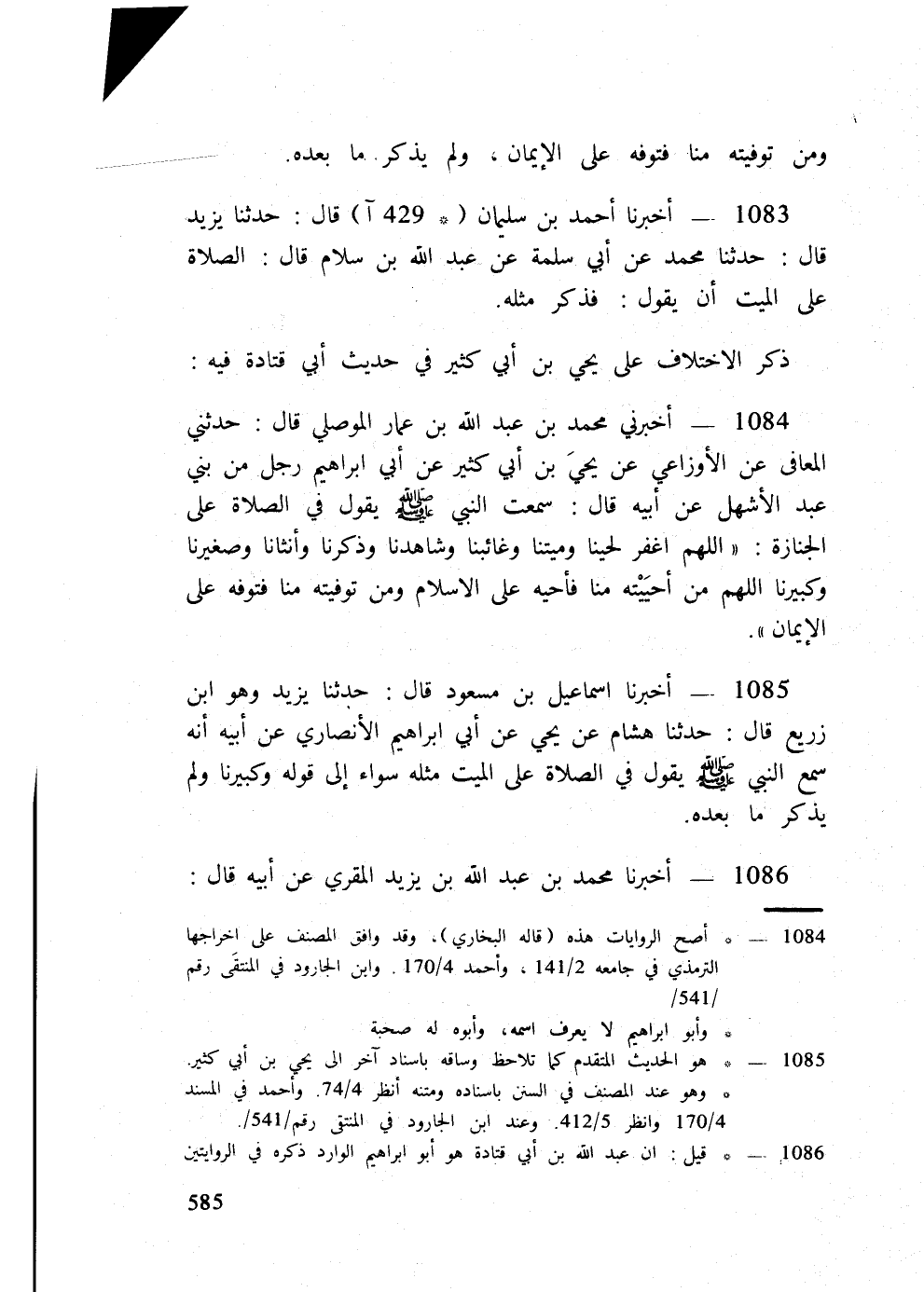 1083 - أخبرنَا أَحْمد بن سُلَيْمَان (429 آ) قَالَ حَدثنَا يزِيد قَالَ حَدثنَا مُحَمَّد عَن أبي سَلمَة عَن عبد الله بن سَلام قَالَ الصَّلَاة على الْمَيِّت أَن يَقُول فَذكر مثله