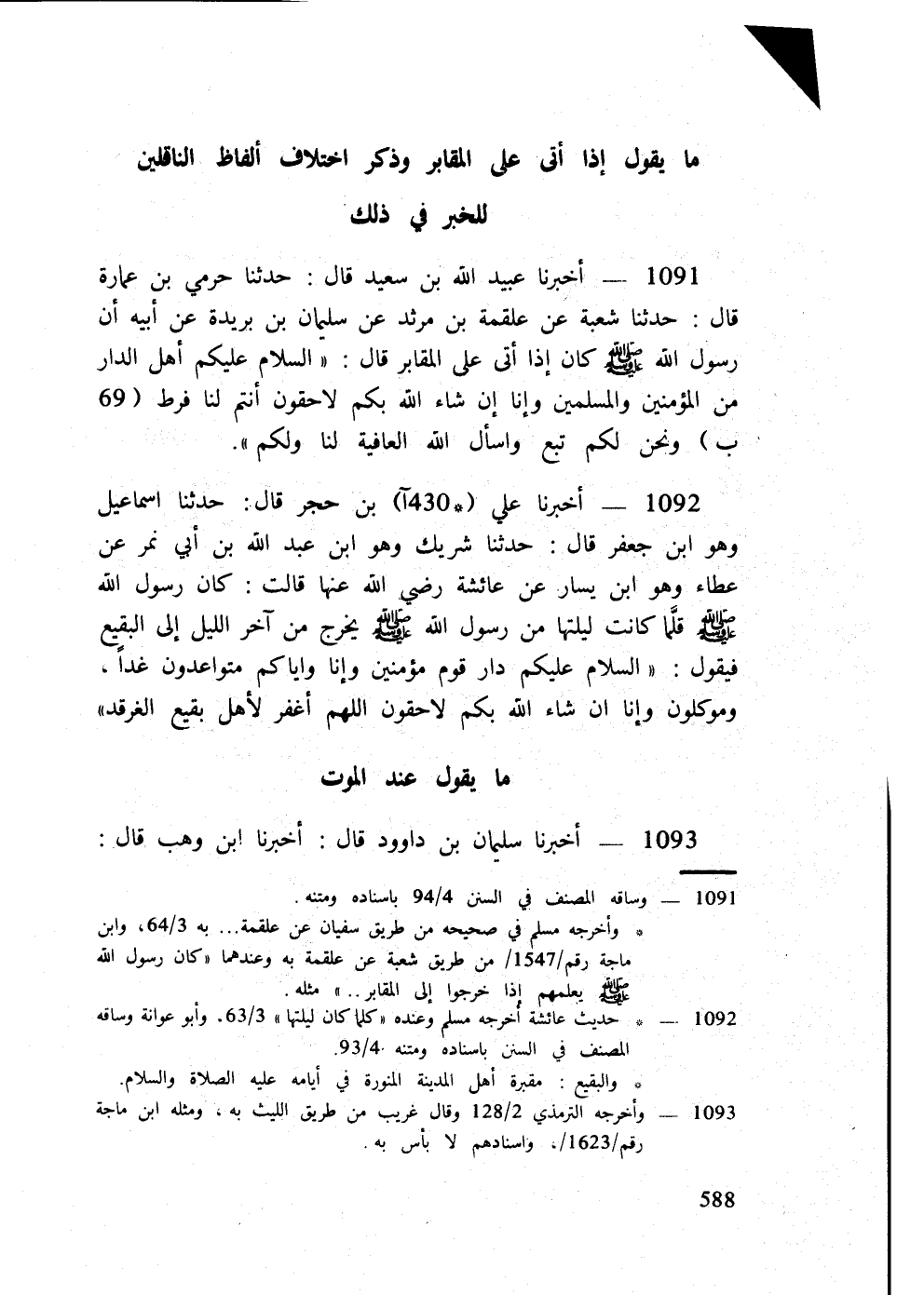 1091 - أخبرنَا عبيد الله بن سعيد قَالَ حَدثنَا حرمي بن عمَارَة قَالَ حَدثنَا شُعْبَة عَن عَلْقَمَة بن مرْثَد عَن سُلَيْمَان بن بُرَيْدَة عَن أَبِيه أَن رَسُول الله صلى الله عَلَيْهِ وَسلم كَانَ إِذا أَتَى على الْمَقَابِر قَالَ