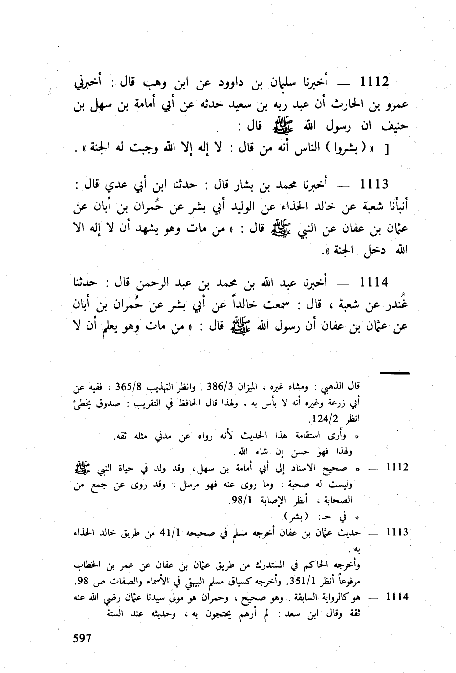 1114 - أخبرنَا عبد الله بن مُحَمَّد بن عبد الرَّحْمَن قَالَ حَدثنَا غنْدر عَن شُعْبَة قَالَ سَمِعت خَالِدا عَن أبي بشر عَن حمْرَان بن أبان عَن عُثْمَان بن عَفَّان أَن رَسُول الله صلى الله عَلَيْهِ وَسلم قَالَ