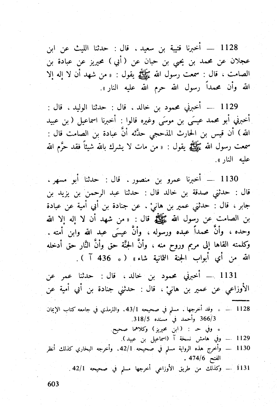 1130 - أخبرنَا عَمْرو بن مَنْصُور قَالَ حَدثنَا أَبُو مسْهر قَالَ حَدثنِي صَدَقَة بن خَالِد قَالَ حَدثنَا عبد الرَّحْمَن بن يزِيد بن جَابر قَالَ حَدثنِي عُمَيْر بن هَانِيء عَن جُنَادَة بن أبي أُميَّة عَن عبَادَة بن الصَّامِت عَن رَسُول الله صلى الله عَلَيْهِ وَسلم قَالَ