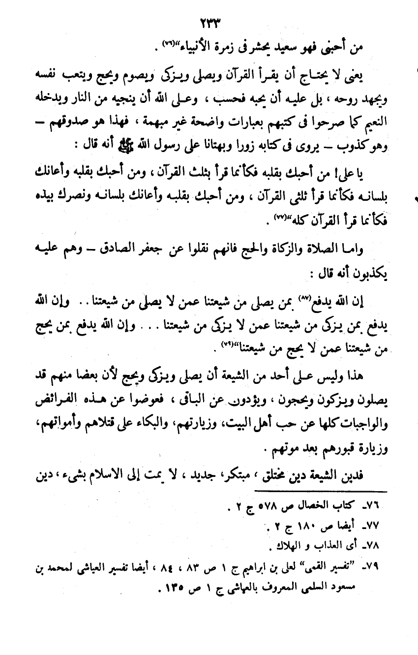 هذا وليس على أحد من الشيعة أن يصلي ويزكي ويحج لأن بعضاً منهم قد يصلون ويزكون ويحجون، ويؤدون عن الباقي، فعوضوا عن هذه الفرائض والواجبات كلها عن حب أهل البيت، وزيارتهم، والبكاء على قتلاهم وأمواتهم، وزيارة قبورهم بعد موتهم.