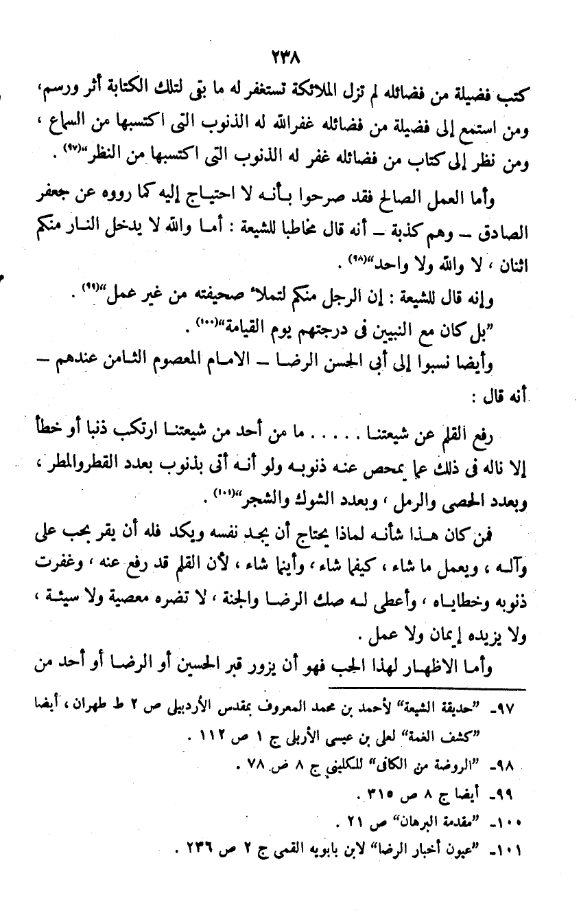 وأما العمل الصالح فقد صرحوا بأنه لا احتياج إليه كما رووه عن جعفر الصادق - وهم كذبة - أنه قال مخاطباً للشيعة: أما والله لا يدخل النار منكم اثنان، لا والله ولا واحد" (¬2).