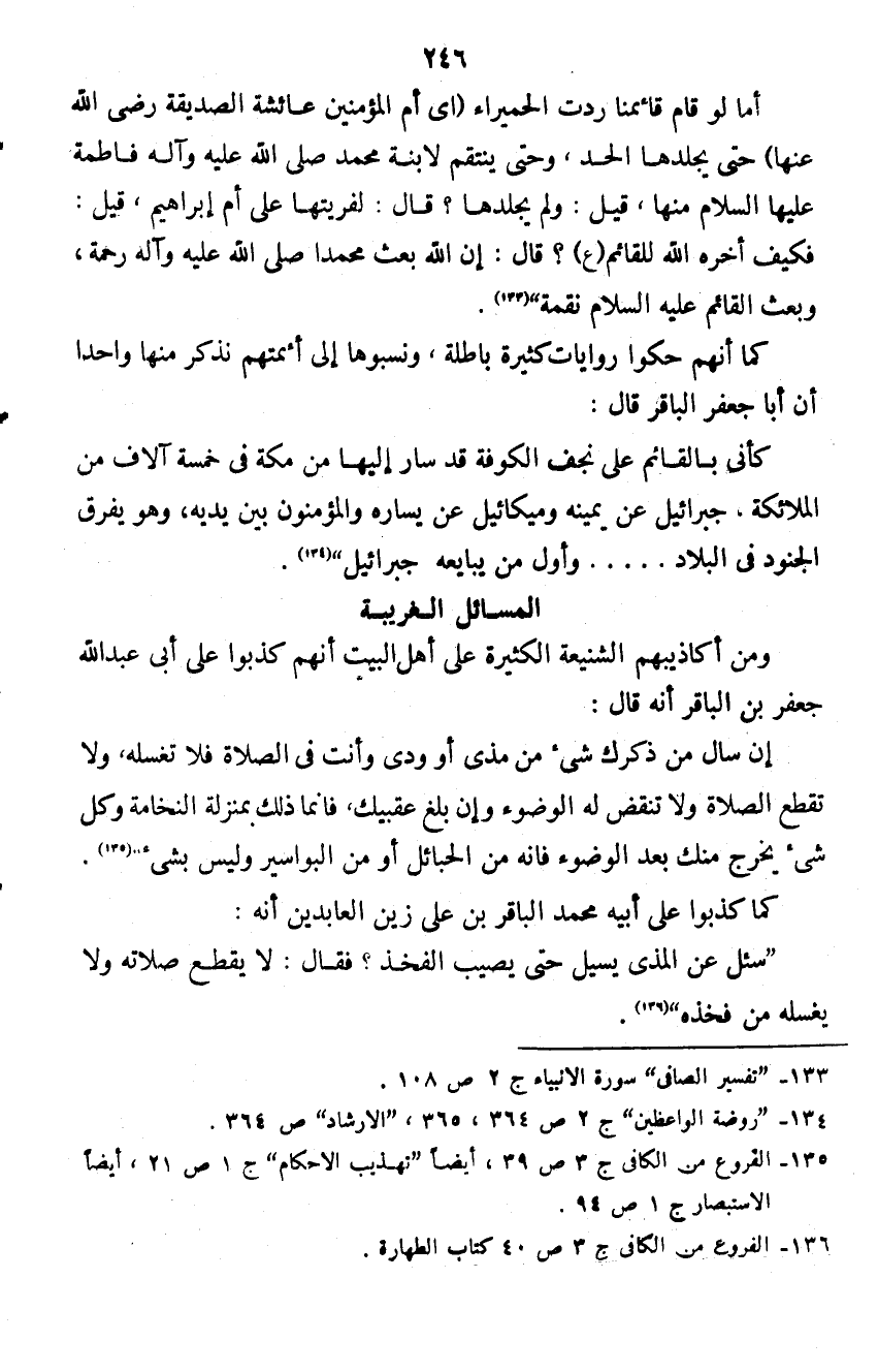 أما لو قام قائمنا ردت الحميراء (أي أم المؤمنين عائشة الصديقة رضي الله عنها) حتى يجلدها الحد، وحتى ينتقم لابنة محمد - صلى الله عليه وسلم - فاطمة عليها السلام منها، قيل: ولم يجلدها؟ قال: لفريتها على أم إبراهيم، قيل: فكيف أخره الله للقائم (ع)؟ قال: إن الله بعث محمداً - صلى الله عليه وسلم - رحمة، وبعث القائم عليه السلام نقمة" (¬1).