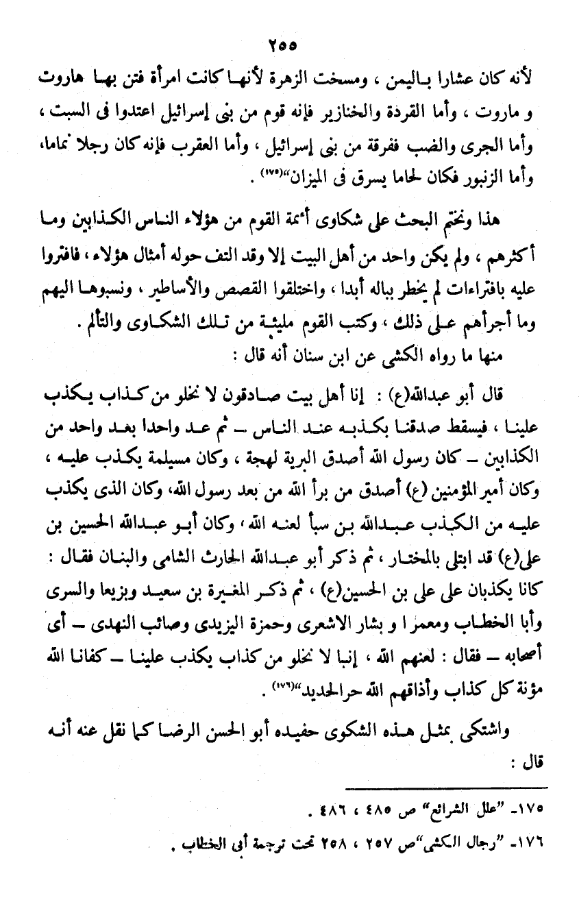 قال أبو عبد الله (ع): إنا أهل البيت صادقون لا نخلو من كذاب يكذب علينا، فيسقط صدقنا بكذبه عند الناس - ثم عد واحداً بعد واحد من الكذابين - كان رسول الله أصدق البرية لهجة، وكان مسيلمة يكذب عليه، وكان أمير المؤمنين (ع) أصدق من برأ الله من بعد رسول الله وكان الذي يكذب عليه من الكذب عبد الله بن سبأ لعنه الله، وكان أبو عبد الله الحسين بن علي (ع) قد ابتلي بالمختار، ثم ذكر أبو عبد الله الحارث الشامي والبنان فقال: كانا يكذبان على علي بن الحسين (ع) ثم ذكر المغيرة بن سعيد وبزيعا والسري وأبا الخطاب ومعمراً وبشار الأشعري وحمزة اليزيدي وصائب النهدي - أي أصحابه - فقال: لعنهم الله، إنا لا نخلو من كذاب يكذب علينا - كفانا الله مؤنة كل كذاب وأذاقهم الله حر الحديد" (¬2).
