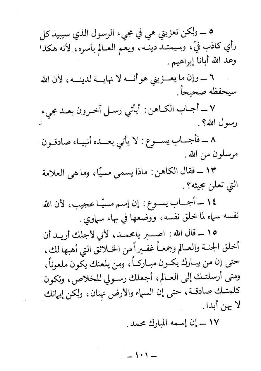 5- ولكن تعزيتي هي في مجيء الرسول الذي سيبيد كل رأي كاذب فيّ، وسيمتد دينه، ويعم العالم بأسره، لأنه هكذا وعد الله أبانا إبراهيم.