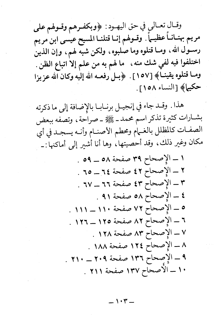 هذا. وقد جاء في إنجيل برنابا بالإضافة إلى ما ذكرته بشارات كثيرة تذكر اسم محمد صلى الله عليه وسلم صراحة، وتصفه ببعض الصفات كالمظلل بالغمام ومحطم الأصنام وأنه يسجد في أي مكان وغير ذلك، وقد أحصيتها، وها أنا أشير إلى أماكنها: