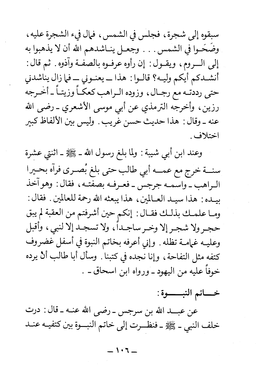 سبقوه إلى شجرة، فجلس في الشمس، فمال فيء الشجرة عليه، وضحوا في الشمس ... وجعل يناشدهم الله أن لا يذهبوا به إلى الروم، ويقول: إن رأوه عرفوه بالصفة وآذوه. ثم قال: أنشدكم أيكم وليه؟ قالوا: هذا يعنوني فما زال يناشدني حتى رددته مع رجال، وزوده الراهب كعكا وزيتا أخرجه رزين"، وأخرجه الترمذي عن أبي موسى الأشعري رضي الله عنه وقال: هذا حديث حسن غريب. وليس بين الألفاظ كبير اختلاف.