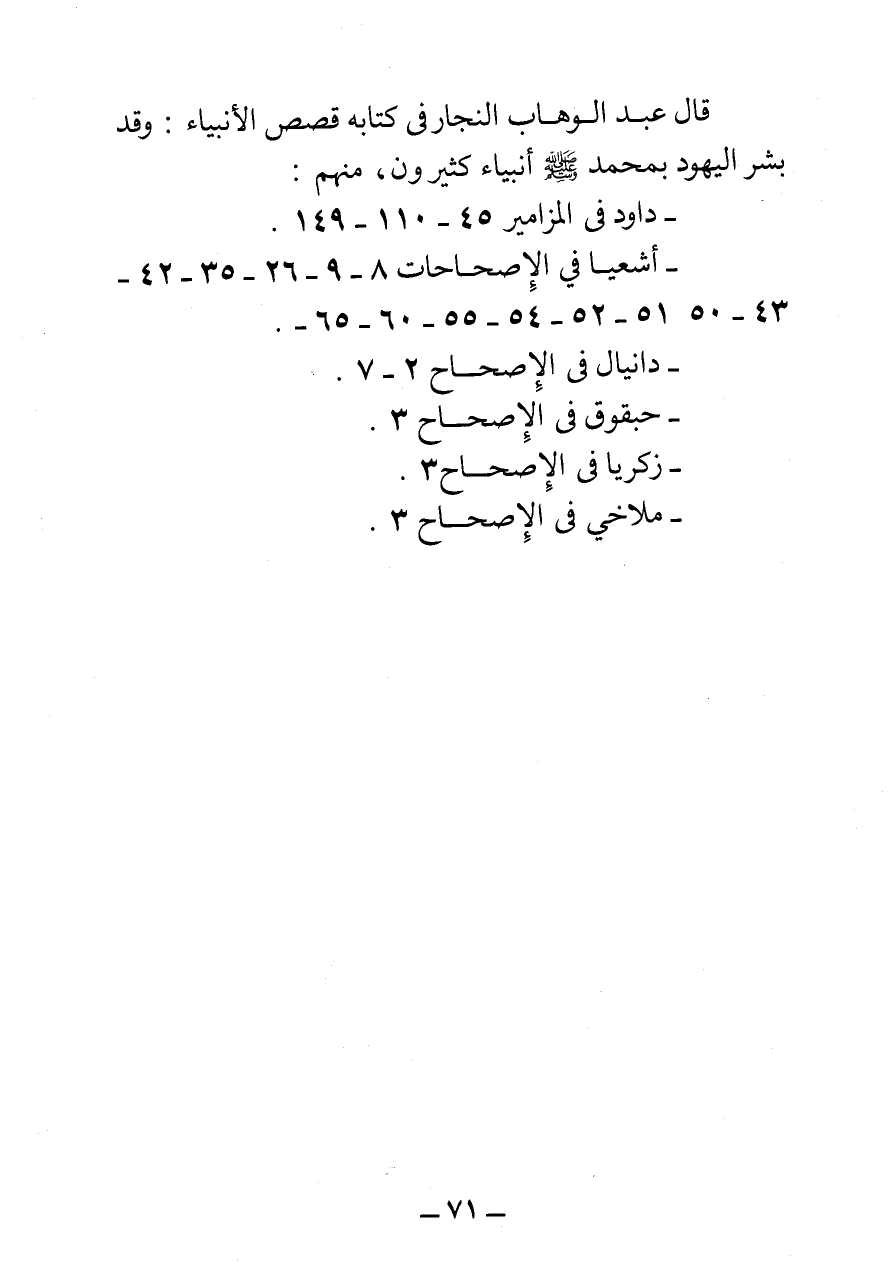 قال عبد الوهاب النجار في كتابه قصص الأنبياء:"وقد بشر اليهود بمحمد صلى الله عليه وسلم أنبياءء كثيرون، منهم: