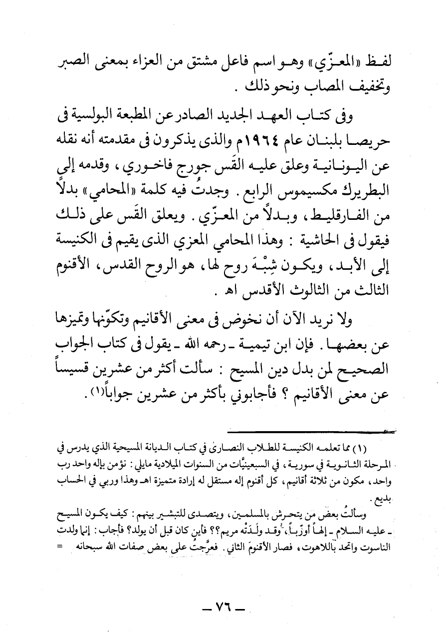 1 مما تعلمه الكنيسة للطلاب النصارى في كتاب الديانة المسيحية الذي يدرس في المرحلة الثانوية في سورية، في السبعينيات من السنوات الميلادية ما يلي: نؤمن بإله واحد رب واحد، مكون من ثلاثة أقانيم، كل أقنوم إله مستقل له إرادة متميزة أهـ وهذا وربي في الحساب بديع.