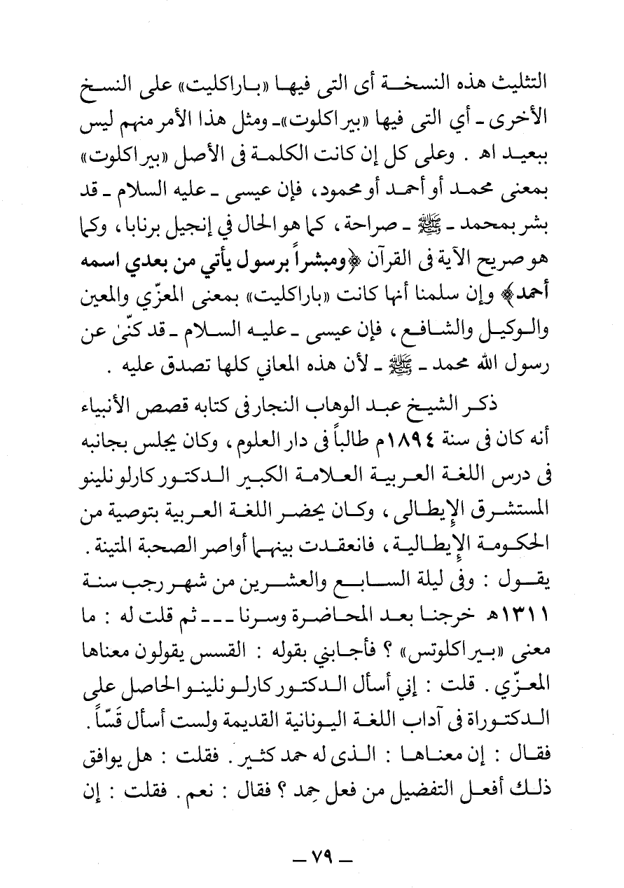التثليث هذه النسخة أي التي فيها"باراكليت"على النسخ الأخرى أي التي فيها"بيراكلوت"ومثل هذا الأمر منهم ليس ببعيد اهـ. وعلى كل إن كانت الكلمة في الأصل"بيراكلوت"بمعنى محمد أو أحمد أو محمود، فإن عيسى عليه السلام قد بشر بمحمد صلى الله عليه وسلم صراحة، كما هو الحال في إنجيل برنابا، وكما هو صريح الآية في القرآن {وَمُبَشِّراً بِرَسُولٍ يَأْتِي مِنْ بَعْدِي اسْمُهُ أَحْمَدُ} وإن سلمنا أنها كانت"باراكليت"بمعنى المعزي والمعين والوكيل والشافع، فإن عيسى عليه السلام قد كنى عن رسول الله محمد صلى الله عليه وسلم لأن هذه المعاني كلها تصدق عليه. ذكر الشيخ عبد الوهاب النجار في كتابه قصص الأنبياء