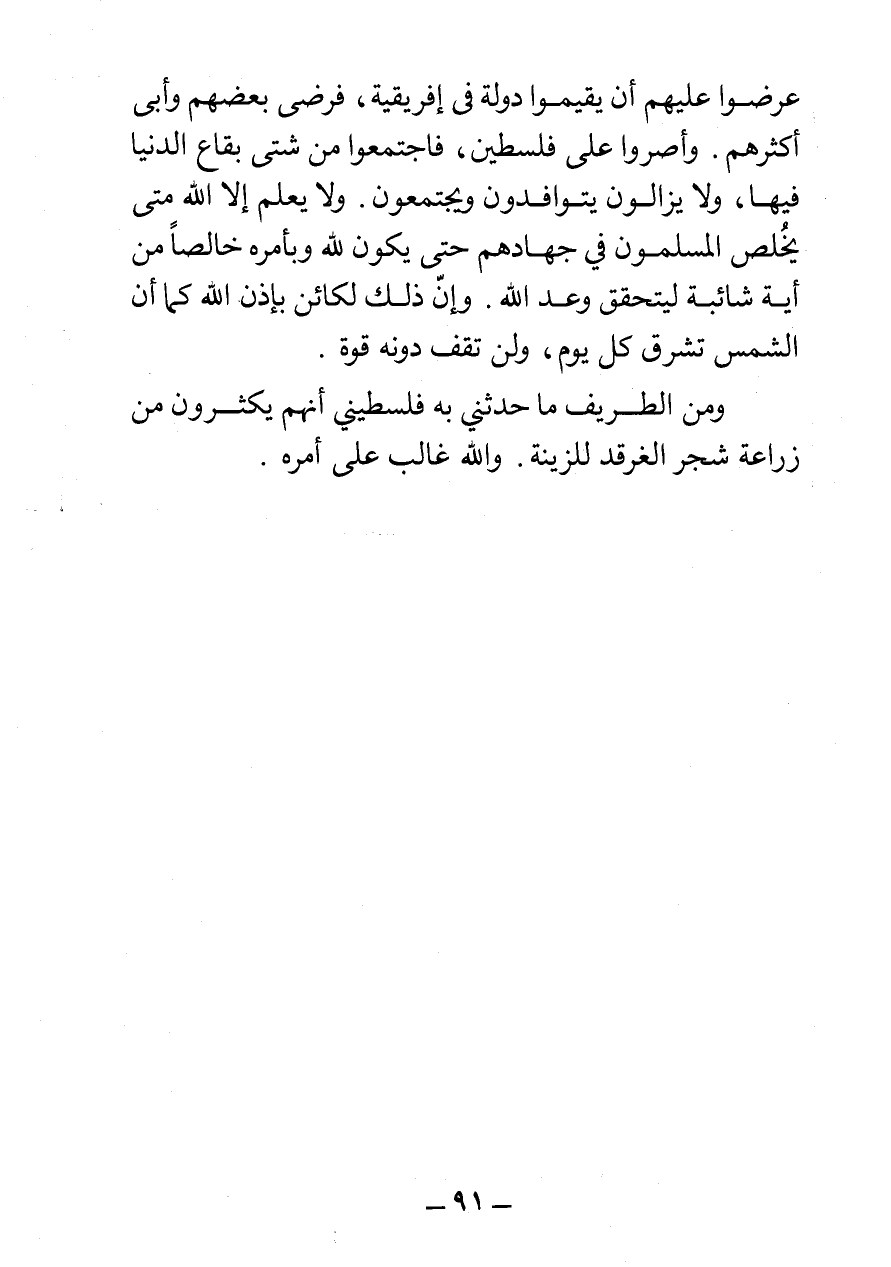 عرضوا عليهم أن يقيموا دولة في إفريقية، فرضي بعضهم وأبى أكثرهم. وأصروا على فلسطين، فاجتمعوا من شتى بقاع الدنيا فيها، ولا يزالون يتوافدون ويجتمعون. ولا يعلم إلا الله متى يُخلص المسلمون في جهادهم حتى يكون لله وبأمره خالصا من أية شائبة ليتحقق وعد الله. وإن ذلك لكائن بإذن الله كما أن الشمس تشرق كل يوم، ولن تقف دونه قوة.