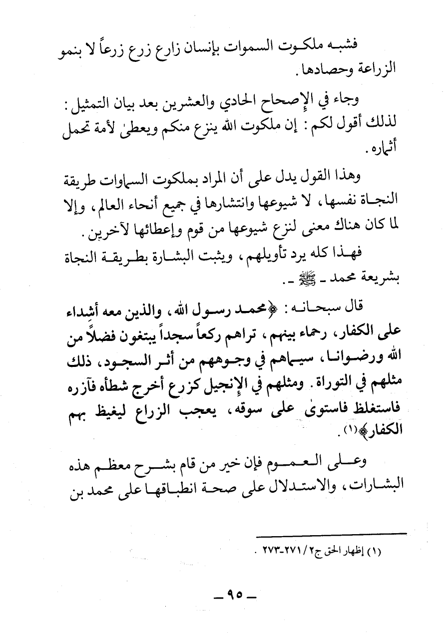 وهذا القول يدل على أن المراد بملكوت السماوات طريقة النجاة نفسها، لا شيوعها وانتشارها في جميع أنحاء العالم، وإلا لما كان هناك معنى لنزع شيوعها من قوم وإعطائها لآخرين. فهذا كله يرد تأويلهم، ويثبت البشارة بطريقة النجاة بشريعة محمد صلى الله عليه وسلم.