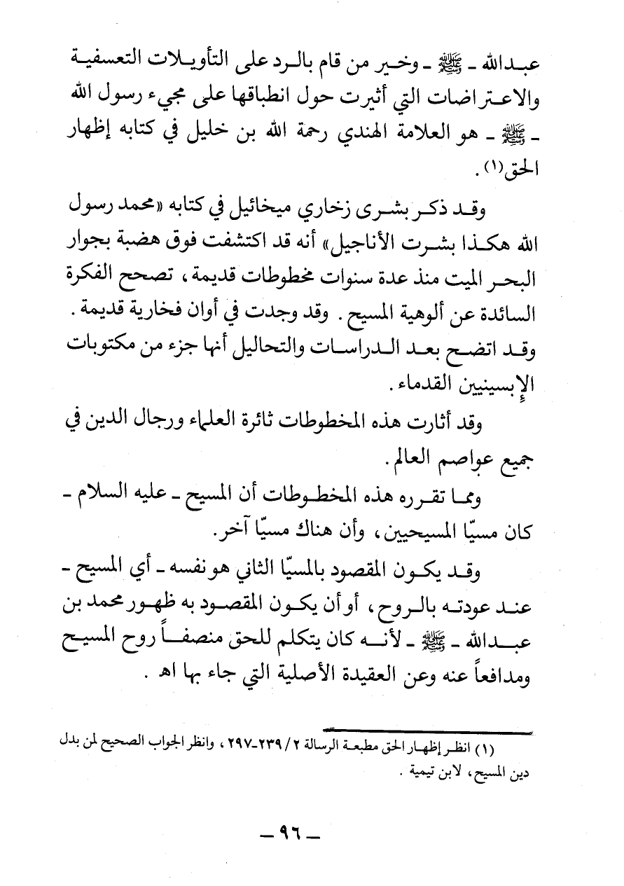 1 انظر إظهار الحق مطبعة الرسالة 2/ 239-297، وانظر الجواب الصحيح لمن بدل دين المسيح، لابن تيمية.