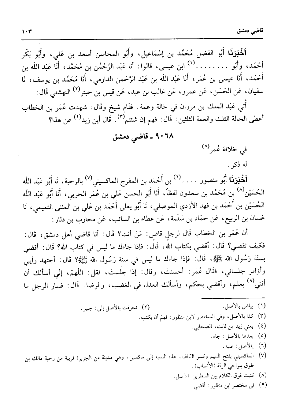 9068 - قاضي دمشق في خلافة عمر (5) له ذكر أخبرنا أبو منصور