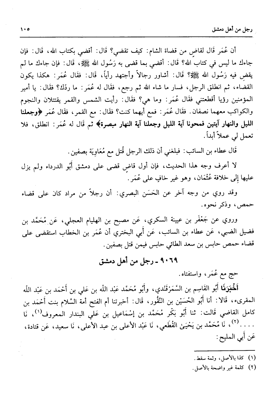9069 - رجل من أهل دمشق حج مع عمر واستفتاه أخبرنا أبو القاسم بن السمرقندي وأبو محمد عبد الله بن علي بن أحمد بن عبد الله المقرئ قالا أنا أبو الحسين بن النقور قال أخبرتنا أم الفتح أمة السلام بنت أحمد بن كامل القاضي قالت ثنا أبو بكر محمد بن إسماعيل بن علي البندار المعروف (1) نا