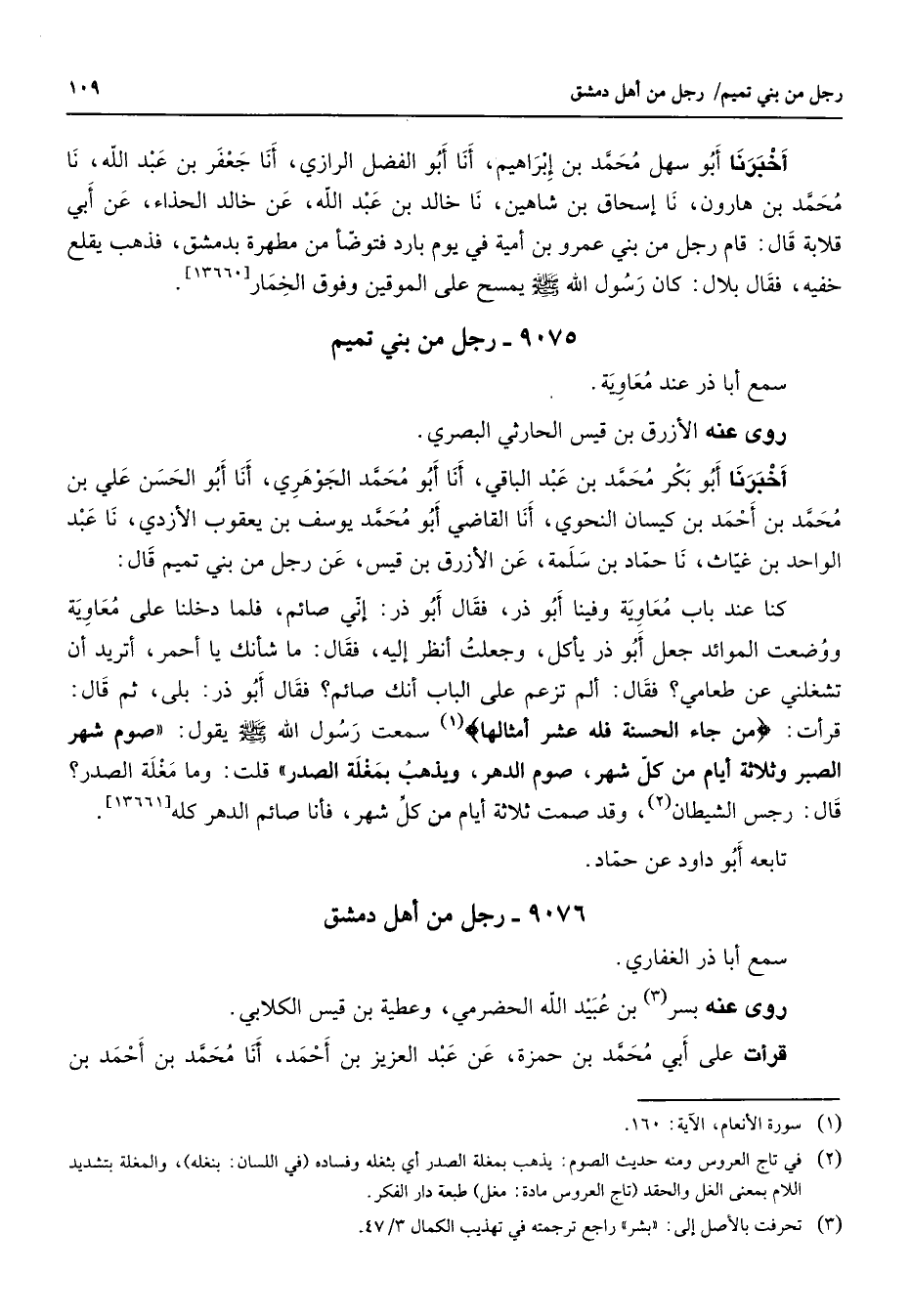 9075 - رجل من بني تميم سمع أبا ذر عند معاوية روى عنه الأزرق بن قيس الحارثي البصري أخبرنا أبو بكر محمد بن عبد الباقي أنا أبو محمد الجوهري أنا أبو الحسن علي بن محمد بن أحمد بن كيسان النحوي أنا القاضي أبو محمد يوسف بن يعقوب الأزدي نا عبد الواحد بن غياث نا حماد بن سلمة عن الأزرق بن قيس عن رجل من بني تميم قال كنا عند باب معاوية وفينا أبو ذر فقال أبو ذر إني صائم فلما دخلنا على معاوية ووضعت الموائد جعل أبو ذر يأكل وجعلت أنظر إليه فقال ما شأنك يا أحمر أتريد أن تشغلني عن طعامي فقال ألم تزعم على الباب أنك صائم فقال أبو ذر بلى ثم قال قرأت " من جاء الحسنة فله عشر امثالها " (1) سمعت رسول الله (صلى الله عليه وسلم) يقول صوم شهر الصبر وثلاثة أيام من كل شهر صوم الدهر ويذهب بمغلة الصدر قلت وما مغلة الصدر قال رجس من الشيطان (2) وقد صمت ثلاثة أيام من كل شهر فأنا صائم الدهر كله