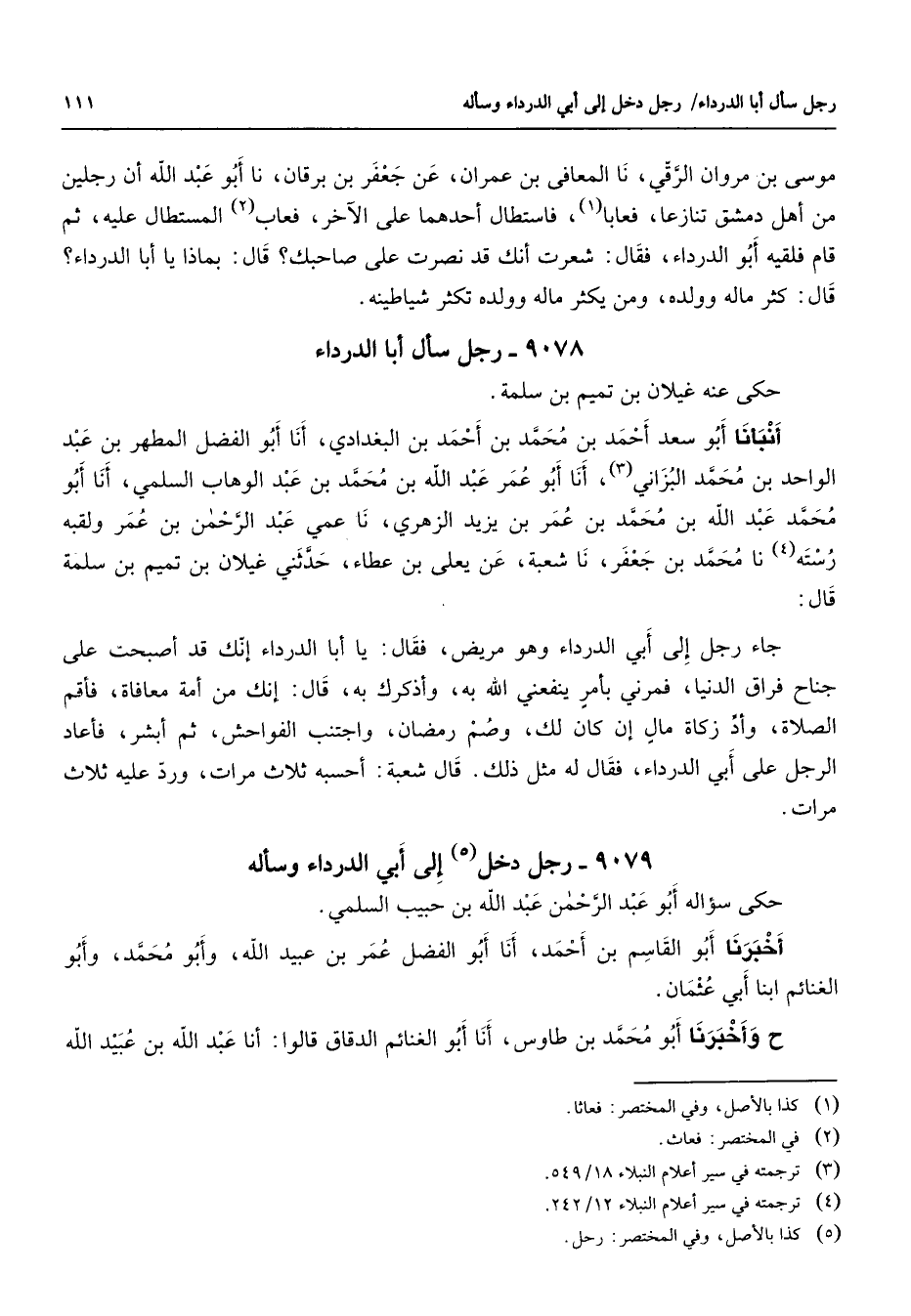 9079 - رجل دخل (5) إلى أبي الدرداء وسأله حكى سؤاله أبو عبد الرحمن عبد الله بن حبيب السلمي أخبرنا أبو القاسم بن أحمد أنا أبو الفضل عمر بن عبيد الله وأبو محمد وأبو الغنائم ابنا أبي عثمان ح وأخبرنا أبو محمد بن طاوس أنا أبو الغنائم الدقاق قالوا أنا عبد الله بن عبيد الله