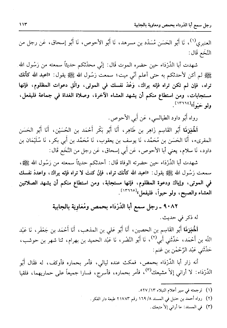 9082 - رجل سمع أبا الدرداء بحمص ومعاوية بالجابية له ذكر في حديث أخبرنا أبو القاسم بن الحصين أنا أبو علي بن المذهب أنا أحمد بن جعفر نا عبد الله بن احمد حدثني أبي (2) نا أبو النضر نا عبد الحميد بن بهرام ثنا شهر بن حوشب حدثني عبد الرحمن بن غنم أنه زار أبا الدرداء بحمص فمكث عنده ليالي فأمر بحماره فأوكف له فقال أبو الدرداء لا أراني إلا مشيعك (3) فأمر بحماره فأسرج فسارا جميعا على حماريهما فلقيا