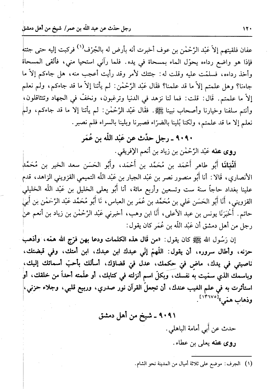 9090 - رجل حدث عن عبد الله بن عمر روى عنه عبد الرحمن بن زياد بن أنعم الإفريقي أنبأنا أبو طاهر أحمد بن محمد بن أحمد وأبو الحسن سعد الخير بن محمد الأنصاري قالا أنا أبو منصور نصر بن عبد الجبار بن عبد الله التميمي القزويني الزاهد قدم علينا بغداد حاجا سنة ست وتسعين وأربع مائة أنا أبو يعلى الخليل بن عبد الله الخليلي القزويني أنا أبو الحسن علي بن محمد بن عمر بن العباس نا أبو محمد عبد الرحمن بن أبي حاتم أخبرنا يونس بن عبد الأعلى أنا ابن وهب أخبرني عبد الرحمن بن زياد بن أنعم عن رجل من أهل دمشق أن عبد الله بن عمر كان يقول إن رسول الله (صلى الله عليه وسلم) كان يقول من قال هذه الكلمات ودعا بهن فرج الله همه وأذهب حزنه وأطال سروره أن يقول اللهم إني عبدك ابن عبدك ابن أمتك وفي قبضتك ناصيتي في يدك ماض في حكمك عدل في قضاؤك أسألك بأحب أسمائك إليك وباسمك الذي سميت به نفسك وبكل اسم أنزلته في كتابك أو علمته أحدا من خلقك أو استأثرت به في علم الغيب عندك أن تجعل القرآن نور صدري وربيع قلبي وجلاء حزني وذهاب همي