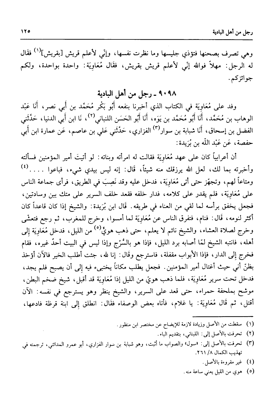 9098 - رجل من أهل البادية وفد على معاوية في الكتاب الذي أخبرنا بنفعه أبو بكر محمد بن أبي نصر أنا عبد الوهاب بن محمد أنا أبو محمد بن يوه أنا أبو الحسن اللنباني (2) نا ابن أبي الدنيا حدثني الفضل بن إسحاق أنا شبابة بن سوار (3) الفزاري حدثني علي بن عاصم عن عمارة ابن أبي حفصة عن عبد الله بن بريدة أن أعرابيا كان على عهد معاوية فقالت له امرأته وبناته لو أتيت أمير المؤمنين فسألته وأخبرته بما لك لعل الله يرزقك منه شيئا قال إنه ليس بيدي شئ فباعوا