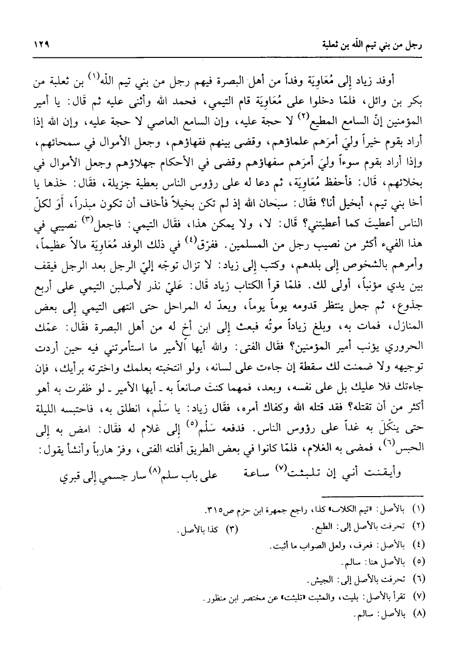 أوفد زياد إلى معاوية وفدا من أهل البصرة فيهم رجل من بني تيم الله (1) بن ثعلبة من بكر بن وائل فلما دخلوا على معاوية قام التيمي فحمد الله وأثنى عليه ثم قال يا أمير المؤمنين إن السامع المطيع (2) لا حجة عليه وإن السامع العاصي لا حجة عليه وإن الله إذا أراد بقوم خيرا ولي أمرهم علماؤهم وقضى بينهم فقهاؤهم وجعل الأموال في سمحائهم وإذا أراد بقوم سوءا ولي أمرهم سفهاؤهم وقضى في الأحكام جهلاؤهم وجعل الأموال في بخلائهم قال فأحفظ معاوية ثم دعا له على رؤوس الناس بعطية جزيلة فقال خذها يا أخا بني تميم أبخيل أنا فقال سبحان الله إذ لم تكن بخيلا فأخاف أن تكون مبذرا أو لكل الناس أعطيت كما أعطيتني قال لا ولا يمكن هذا فقال التميمي فاجعل (3) نصيبي في هذا الفئ أكثر من نصيب رجل من المسلمين ففرق (4) في ذلك الوفد معاوية مالا عظيما وأمرهم بالشخوص إلى بلدهم وكتب إلى زياد لا تزال توجه إلي الرجل بعد الرجل فيقف بين يدي مؤنبا أولى لك فلما قرأ الكتاب زياد قال علي نذر لأصلبن التيمي على أربع جذوع ثم جعل ينتظر قدومه يوما يوما ويعد له المراحل حتى انتهى التيمي إلى بعض المنازل فمات به وبلغ زيادا موته فبعث إلى ابن أخ له من أهل البصرة فقال عمك الحروري يؤنب أمير المؤمنين فقال الفتى والله أيها الأمير ما استأمرتني فيه حين أردت توجيهه ولا ضمنت لك سقطة إن جاءت على لسانه ولو انتخبته بعلمك واخترته برأيك فإن جاءتك فلا عليك بل على نفسه وبعد فمهما كنت صانعا به أيها الأمير لو ظفرت به أهو أكثر من أن تقتله فقد قتله الله وكفاك أمره فقال زياد يا سلم انطلق به فاحتبسه الليلة حتى ينكل به غدا على رؤوس الناس فدفعه سلم (5) إلى غلام له فقال امض به إلى الحبس (6) فمضى به الغلام فلما كانوا في بعض الطريق أفلته الفتى وفر هاربا وأنشأ يقول * وأيقنت أني إن تلبثت (7) ساعة * على باب سلم (8) سار جسمي إلى قبري