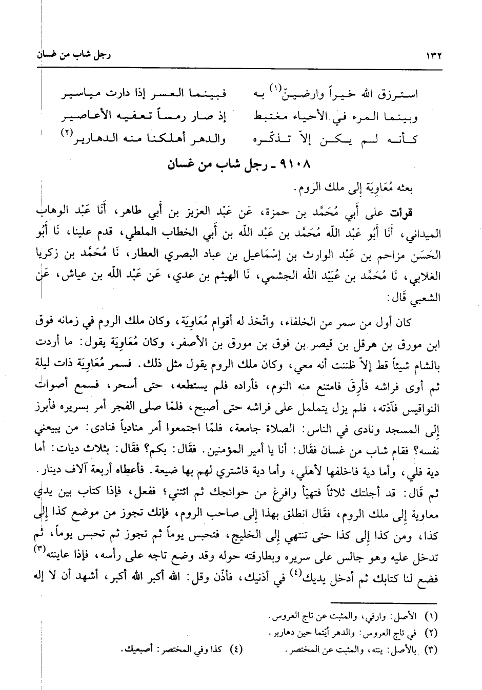 9108 - رجل شاب من غسان بعث معاوية إلى ملك الروم قرأت على أبي محمد بن حمزة عن عبد العزيز بن أبي طاهر أنا عبد الوهاب الميداني أنا أبو عبد الله محمد بن عبد الله بن أبي الخطاب الملطي قدم علينا نا أبو الحسن مزاحم بن عبد الوارث بن إسماعيل بن عباد البصري العطار نا محمد بن زكريا الغلابي نا محمد بن عبيد الله الجشمي نا الهيثم بن عدي عن عبد الله بن عياش عن الشعبي قال كان أول من سمر من الخلفاء واتخذ له أقوام معاوية وكان ملك الروم في زمانه فوق ابن مورق بن هرقل بن قيصر بن فوق بن مورق بن الأصفر وكان معاوية يقول ما أردت بالشام شيئا قط إلا ظننت أنه معي وكان ملك الروم يقول مثل ذلك فسمر معاوية ذات ليلة ثم أوى فراشه فأرق فامتنع منه النوم فأراده فلم يستطعه حتى أسحر فسمع أصوات النواقيس فأذته فلم يزل يتململ على فراشه حتى أصبح فلما صلى الفجر أمر بسريره فأبرز إلى المسجد ونادى في الناس الصلاة جامعة فلما اجتمعوا أمر مناديا فنادى من يبيعني نفسه فقام شاب من غسان فقال أنا يا أمير المؤمنين فقال بكم فقال بثلاث ديات أما دية فلي وأما دية فاخلفها لأهلي وأما دية فاشتري لهم بها ضيعة فأعطاه أربعة آلاف دينار ثم قال قد أجلتك ثلاثا فتهيأ وافرغ من حوائجك ثم ائتني ففعل فإذا كتاب بين يدي معاوية إلى ملك الروم فقال انطلق بهذا إلى صاحب الروم فإنك تجوز من موضع كذا إلى كذا ومن كذا إلى كذا حتى تنتهي إلى الخليج فتحبس يوما ثم تجوز ثم تحبس يوما ثم تدخل عليه وهو جالس على سريره وبطارقته حوله وقد وضع تاجه على رأسه فإذا عاينته (3) فضع لنا كتابك ثم أدخل يديك (4) في أذنيك فأذن وقل الله أكبر الله أكبر أشهد أن لا إله