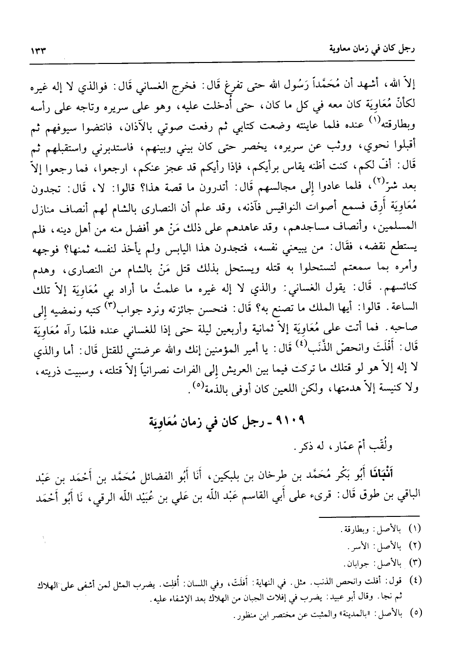 إلا الله أشهد أن محمدا رسول الله حتى تفرغ قال فخرج الغساني قال فوالذي لا إله غيره لكن معاوية كان معه في كل ما كان حتى أدخلت عليه وهو على سريره وتاجه على رأسه وبطارقته (1) عنده فلما عاينته وضعت كتابي ثم رفعت صوتي بالآذان فانتضوا سيوفهم ثم أقبلوا نحوي ووثب عن سريره يخصر حتى كان بيني وبينهم فاستدبرني واستقبلهم ثم قال أف لكم كنت أظنه يقاس برأيكم فإذا رأيكم قد عجز عنكم ارجعوا فما رجعوا إلا بعد شر (2) فلما عادوا إلى مجالسهم قال أتدرون ما قصة هذا قالوا لا قال تجدون معاوية أرق فسمع أصوات النواقيس فآذنه وقد علم النصارى بالشام لهم أنصاف منازل المسلمين وأنصاف مساجدهم وقد عاهدهم على ذلك من هو أفضل منه من أهل دينه فلم يستطع نقضه فقال من يبيعني نفسه فتجدون هذا اليابس ولم يأخذ لنفسه ثمنها فوجهه وأمره بما سمعتم لتستحلوا به قتله ويستحل بذلك قتل من بالشام من النصارى وهدم كنائسهم قال يقول الغساني والذي لا إله غيره ما علمت ما أراد بي معاوية إلا تلك الساعة قالوا أيها الملك ما تصنع به قال فنحسن جائزته ونرد جواب (3) كتبه ونمضيه إلى