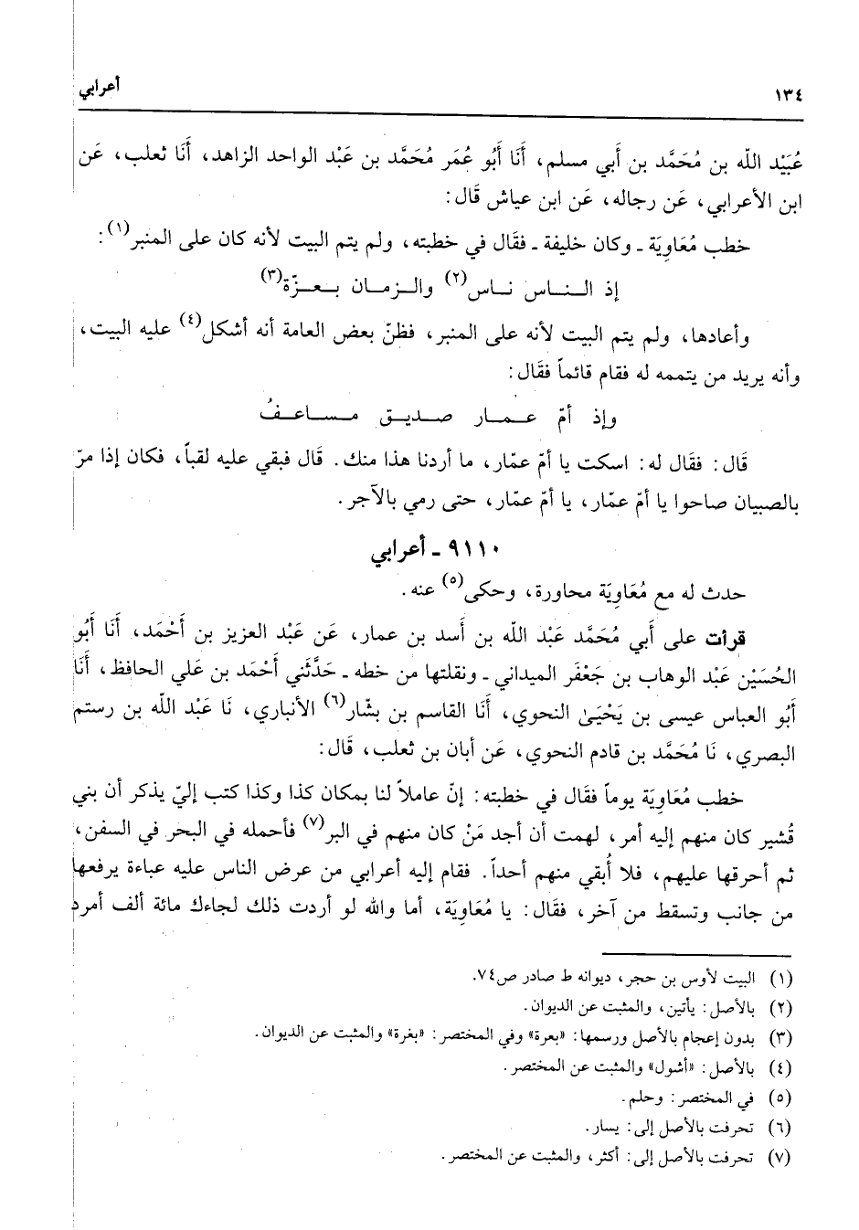 عبيد الله بن محمد بن أبي مسلم أنا أبو عمر محمد بن عبد الواحد الزاهد أنا ثعلب عن ابن ال أعرابي عن رجاله عن ابن عياش قال خطب معاوية وكان خليفة فقال في خطبته ولم يتم البيت لأنه كان على المنبر (1) * إذ الناس ناس (2) والزمان بعزة (3) وأعادها ولم يتم البيت لأنه على المنبر فظن بعض العامة أنه أشكل (4) عليه البيت وأنه يريد من يتممه له فقام قائما فقال * وإذا أم عمار صديق مساعف قال فقال له اسكت يا ام عمار ما أردنا هذا منك قال فبقي عليه لقبا فكان إذا مر بالصبيان صاحوا يا أم عمار يا أم عمار حتى رمي بالآجر 9110 أعرابي حدث له مع معاوية محاورة وحكى (5) عنه قرأت على أبي محمد عبد الله بن أسد بن عمار عن عبد العزيز بن أحمد أنا أبو الحسين عبد الوهاب بن جعفر الميداني ونقلتها من خطه حدثني أحمد بن علي الحافظ انا أبو العباس عيسى بن يحيى النحوي انا القاسم بن بشار (6) الأنباري نا عبد الله بن رستم البصري نا محمد بن قادم النحوي عن أبان بن ثعلب قال خطب معاوية يوما فقال في خطبته إن عاملا لنا بمكان كذا وكذا كتب إلي يذكر أن بني قشير كان منهم إليه أمر لهمت أن أجد من كان منهم في البر (7) فأحمله في البحر في السفن ثم احرقها عليهم فلاأبقي منهم أحدا فقام إليه أعرابي من عرض الناس عليه عباءة يرفعها من جانب وتسقط من آخر فقال يا معاوية أما والله لو أردت ذلك لجاءك مائة ألف أمرد