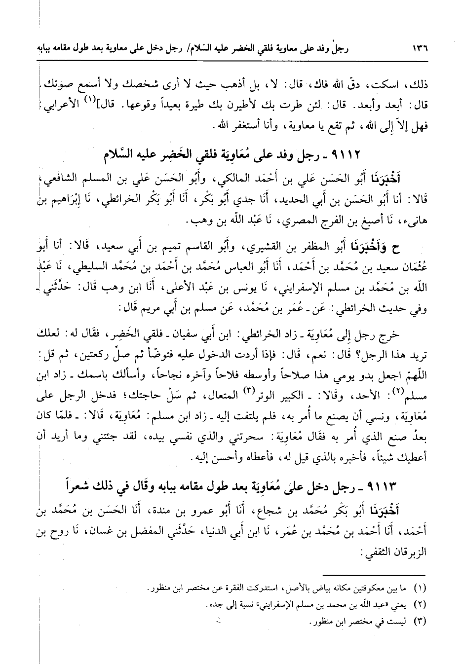 9112 - رجل وفد على معاوية فلقي الخضر عليه السلام أخبرنا أبو الحسن علي بن أحمد المالكي وأبو الحسن علي بن مسلم الشافعي قالا أنا أبو الحسن بن أبي الحديد أنا جدي أبو بكر أنا أبو بكر الخرائطي نا إبراهيم بن هانئ نا أصبغ بن الفرج المصري نا عبد الله بن وهب ح وأخبرنا أبو المظفر بن القشيري وابو القاسم تميم بن أبي سعيد قالا أنا أبو عثمان سعيد بن محمد بن أحمد أنا أبو العباس محمد بن أحمد بن محمد السليطي نا عبد الله بن محمد بن مسلم الإسفرايني نا يونس بن عبد الأعلى أنا ابن وهب قال حدثني وفي حديث الخرائطي عن عمر بن محمد عن مسلم بن أبي مريم قال خرج رجل إلى معاوية زاد الخرائطي ابن أبي سفيان فلقي الخضر فقال له لعلك تريد هذا الرجل قال نعم قال فإذا أردت الدخول عليه فتوضأ ثم صل ركعتين ثم قل اللهم اجعل بدو يومي هذا صلاحا وأوسطه فلاحا وآخره نجاحا وأسألك باسمك زاد ابن مسلم (2) الأحد وقالا الكبير الوتر (3) المتعال ثم سل حاجتك فدخل الرجل على معاوية ونسي أن يصنع ما أمر به فلم يلتفت إليه زاد ابن مسلم معاوية قالا فلما كان بعد صنع الذي أمر به فقال معاوية سحرتني والذي نفسي بيده لقد جئتني وما أريد ان أعطيك شيئا فأخبره بالذي قيل له فأعطاه وأحسن إليه