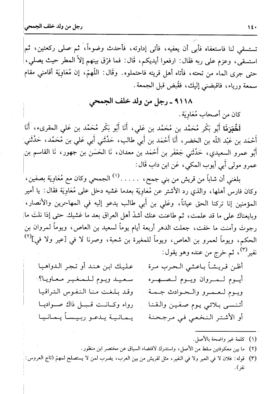 (1) الجمحي وكان مع معاوية بصفين وكان فارس أهلها والذي رد الأشتر عن معاوية بعدما غشية دخل على معاوية فقال يا أمير المؤمنين إنا تركنا الحق عيانا وعلى بن أبي طالب يدعو إليه في المهاجرين والأنصار وبايعناك على ما قد علمت ثم طاعنت عنك أشد أهل العراق بعد ما غشيك حتى إذا نلت ما رجوت وأمنت ما خفت جعلت الدهر أربعة ايام يوما لسعيد بن العاص ويوما لمروان بن الحكم ويوما لعمرو بن العاص ويوما للمغيرة بن شعبة وصرنا لا في عير ولا في (2) نفير (3) ثم خرج من عنده وهو يقول * أظن قريشا باعثي الحرب مرة * عليك ابن هند أو تجر الدواهيا أيوم لمروان ويوم لصهره * سعيد ويوم للمغير معاويا ويوم لعمرو والحوادث جمة * وقد بلغت منا النفوس التراقيا أتنسى بلائي يوم صفين والقنا * رواء وكانت قبل ذاك صواديا أو الأشتر النخعي في مرجحنة * يمانية يدعو ربيسا يمانيا