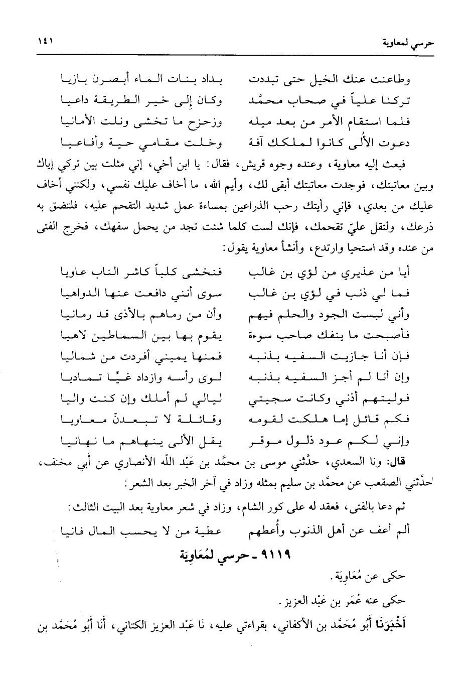 9119 - حرسي لمعاوية حكى عن معاوية حكى عنه عمر بن عبد العزيز أخبرنا أبو محمد بن الأكفاني بقراءتي عليه نا عبد العزيز الكتاني أنا أبو محمد بن