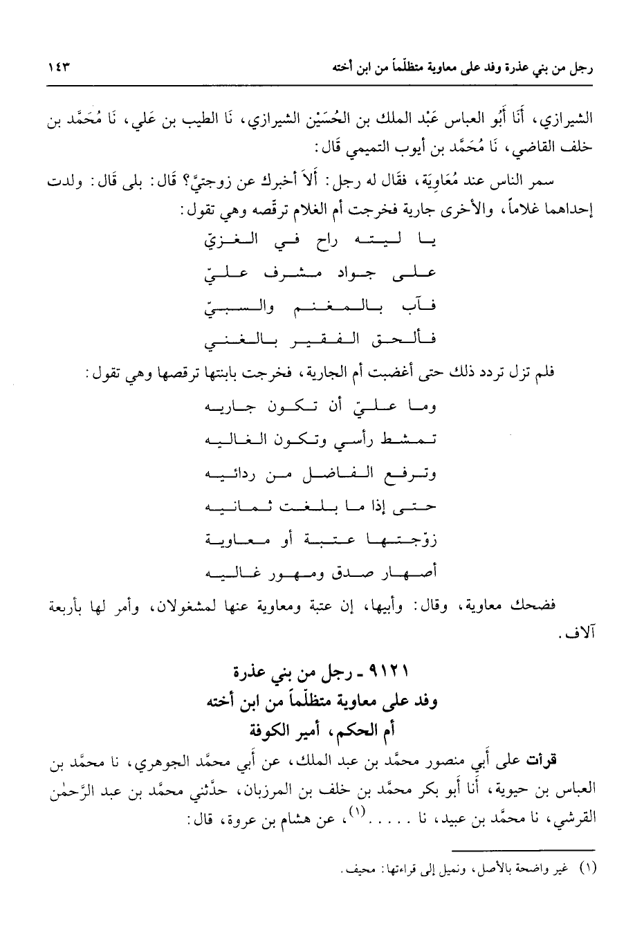 9121 - رجل من بنى عذرة وفد على معاوية متظلما من ابن أخته أم الحكم أمير الكوفة قرأت على أبي منصور محمد بن عبد الملك عن ابي محمد الجوهري نا محمد بن العباس بن حيوية أنا أبو بكر محمد بن خلف بن المرزبان حدثني محمد بن عبد الرحمن القرشي نا محمد بن عبيد نا