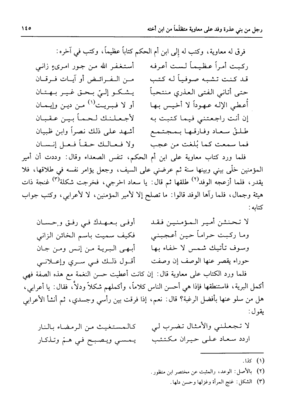 فرق له معاوية وكتب له إلى ابن أم الحكم كتابا عظيما وكتب في آخره * ركبت أمرا عظيما لست أعرفه * أستغفر الله من جور امرئ زاني قد كنت تشبه صوفيا له كتب * من الفرائض أو آيات فرقان حتى أتاني الفتى العذري منتحبا * يشكو إلى بحق غير بهتان أعطي الإله عهودا لا أخيس بها * أو لا فبريت (1) من دين وإيمان إن أنت راجعتني فيما كتبت به * لأجعلنك لحما بين عقبان طلق سعاد وفارقها بمجتمع * أشهد على ذلك نصرا وابن ظبيان فما سمعت كما بلغت من عجب * ولا فعالك حقا فعل إنسان * فلما ورد كتاب معاوية على ابن أم الحكم تنفس الصعداء وقال وددت أن امير المؤمنين خلى بيني وبينها سنة ثم عرضني على السيف وجعل يؤامر نفسه في طلاقها فلا يقدر فلما أزعجه الوفد (2) طلقها ثم قال يا سعاد اخرجي فخرجت شكلة (3) غنجة ذات هيئة وجمال فلما رآها الوفد قالوا ما تصلح إلا لأمير المؤمنين لا لأعرابي وكتب جواب كتابه * لا تحنثن أمير المؤمنين فقد * أوفى بعهدك في رفق وإحسان وما ركبت حراما حين اعجبني * فكيف سميت باسم الخائن الزاني وسوف تأتيك شمس لا خفاء بها * أبهى البرية من إنس ومن جان حوراء يقصر عنها الوصف إن وصفت * أقول ذلك في سري وإعلاني * فلما ورد الكتاب على معاوية قال إن كانت أعطيت حسن النغمة مع هذه الصفة فهي اكمل البرية فاستنظقها فإذا هي أحسن الناس كلاما وأكملهم شكلا ودلا فقال يا اعرابي هل من سلو عنها بأفضل الرغبة قال نعم إذا فرقت بين رأسي وجسدي ثم أنشأ الأعرابي يقول * لا تجعلني والأمثال تضرب لي * كالمستغيث من الرمضاء بالنار اردد سعاد على حيران مكتئب * يمسي ويصبح في هم وتذكار