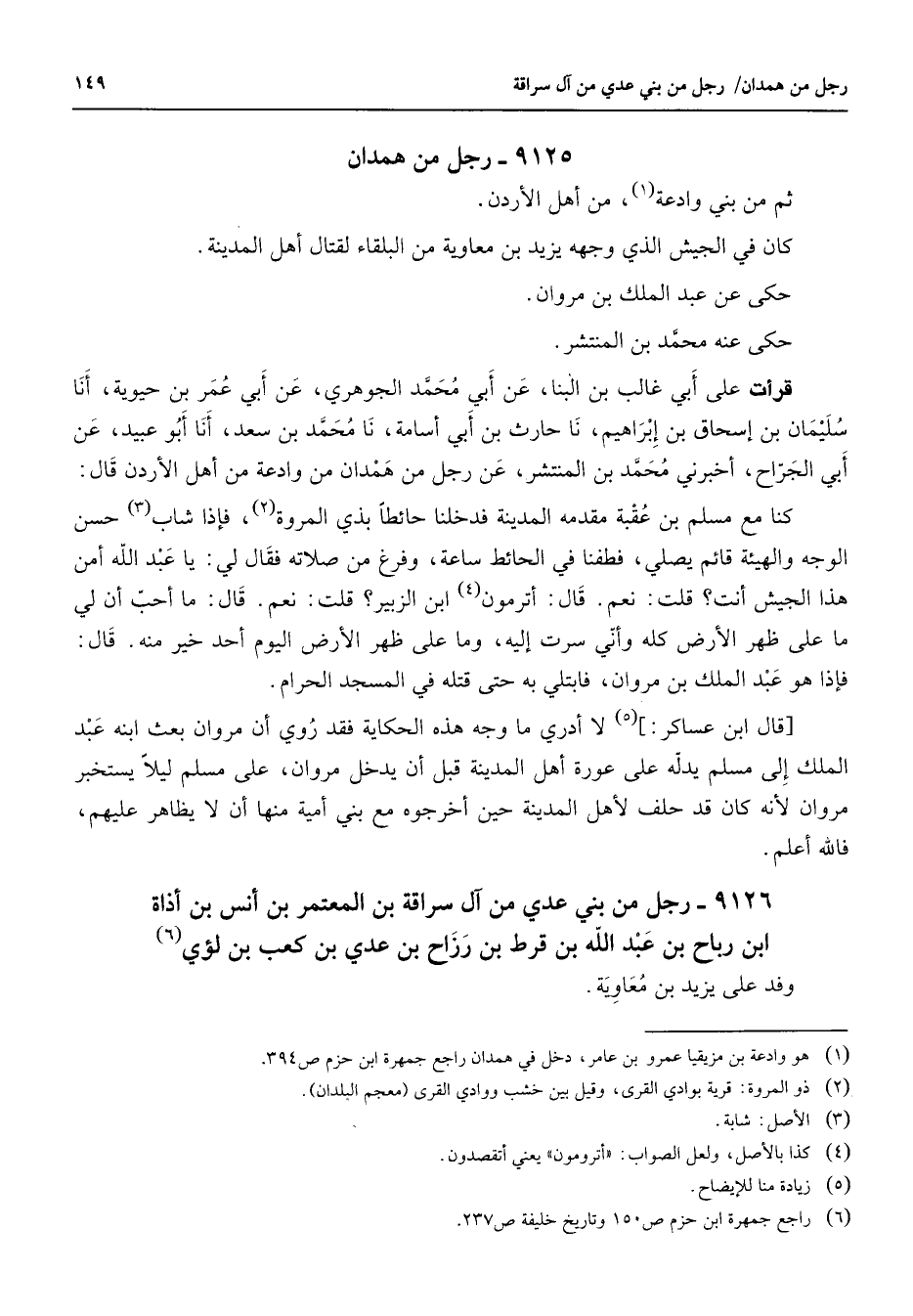 9126 - رجل من بني عدي من آل سراقة بن المعتمر بن أنس بن أذاة ابن رباح بن عبد الله بن قرط بن رزاح بن عدي بن كعب بن لؤي (6) وفد على يزيد بن معاوية