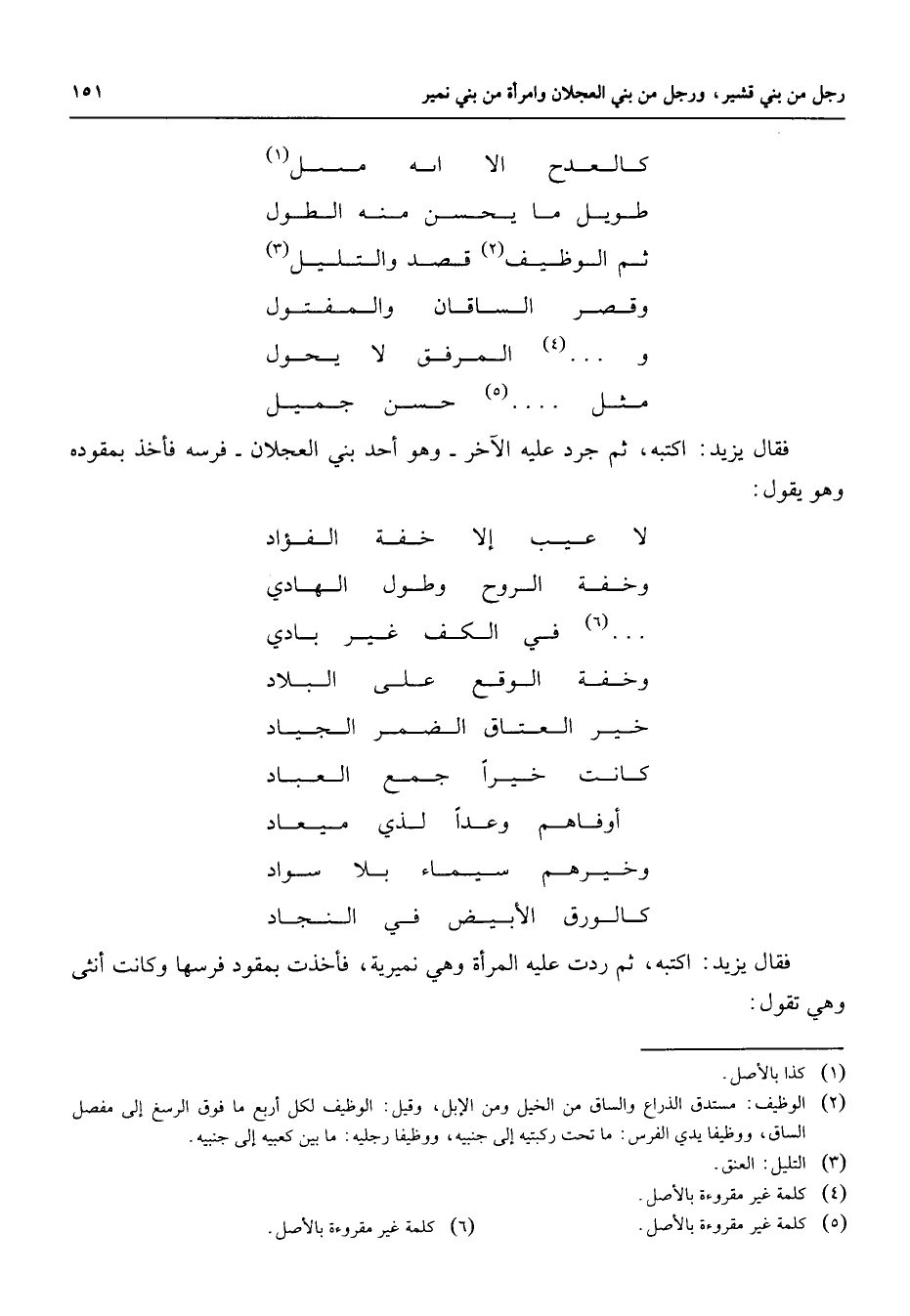 (5) حسن جميل فقال يزيد اكتبه ثم جرد عليه الآخر وهو احد بني العجلان فرسه فأخذ بمقوده وهو يقول * لا عيب إلا خفة الفؤاد * وخفة الروح وطول الهادي *