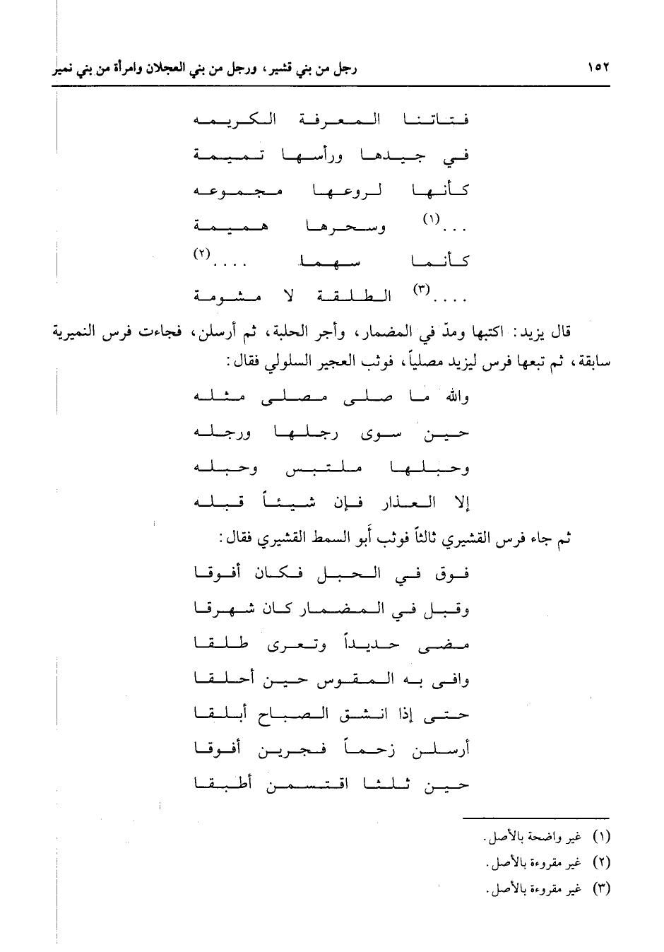 (3) الطلقة لا مشومة قال يزيد اكتبها ومد في المضمار وأجر الحلبة ثم أرسلن فجاءت فرس النميرية سابقة ثم تبعها فرس ليزيد مصليا فوثب العجير السلولي فقال * والله ما صلى مصلى مثله * حين سوى رجلها ورجله * وحبلها ملتبس وحبله * إلا العذار فإن شيئا قبله ثم جاء فرس القشيري ثالثا فوثب أبو السمط القشيري فقال * فوق في الحبل فكان أفوقا * وقبل في المضمار كان شهرقا * مضى حديدا وتعرى طلقا * وافى به المقوس حين أحلقا * حتى إذا انشق الصباح أبلقا * أرسلن زحما فجرين أفوقا * حين ثلثا اقتسمن أطبقا *