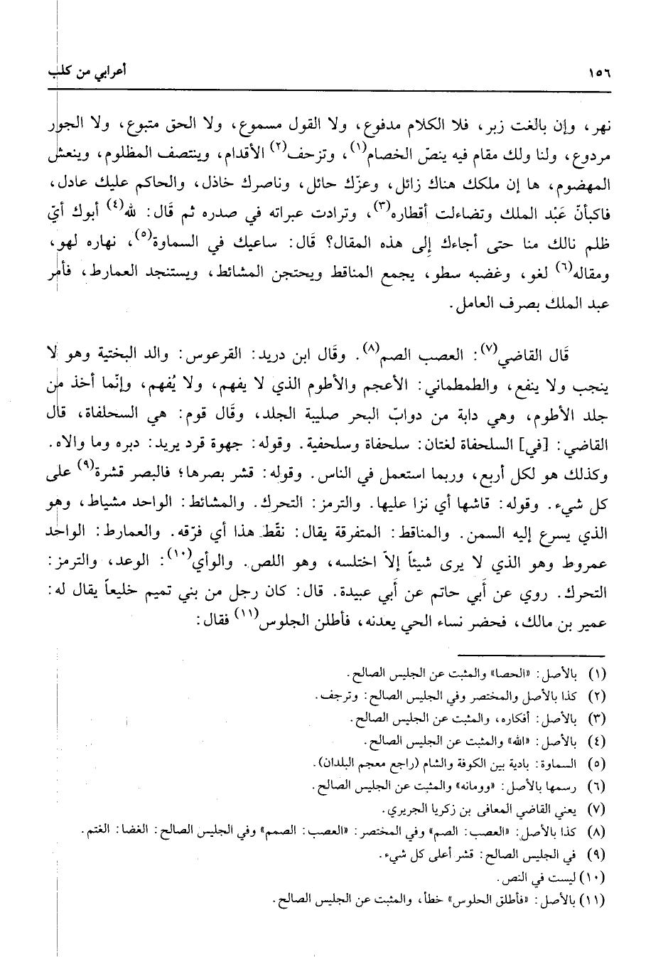 نهر وإن بالغت زبر فلا الكلام مدفوع ولا القول مسموع ولا الحق متبوع ولا الجور مردوع ولنا ولك مقام فيه ينص الخصام (1) وتزحف (2) الأقدام وينتصف المظلوم وينعش المهضوم ها إن ملكك هناك زائل وعزك حائل وناصرك خاذل والحاكم عليك عادل فاكبأن عبد الملك وتضاءلت أقطاره (3) وترادت عبراته في صدره ثم قال لله (4) أبوك أي ظلم نالك منا حتى أجاءك إلى هذه المقال قال ساعيك في السماوة (5) نهاره لهو ومقاله (6) لغو وغضبه سطو يجمع المناقط ويحتجن المشائط ويستنجد العمارط فأمر عبد الملك بصرف العامل قال القاضي (7) العصب الصم (8) وقال ابن دريد القرعوس والد البختية وهو لا ينجب ولا ينفع والطمطماني الأعجم والأطوم الذي لا يفهم ولا يفهم وإنما أخذ من جلد الأطوم وهي دابة من دواب البحر صليبة الجلد وقال قوم هي السلحفاة قال القاضي في السلحفاة لغتان سلحفاة وسلحفية وقوله جهوة قرد يريد دبره وما والاه وكذلك هو لكل أربع وربما استعمل في الناس وقوله قشر بصرها فالبصر قشرة (9) على كل شئ وقوله قاشها أي نزا عليها والترمز التحرك والمشائط الواحد مشياط وهو الذي يسرع إليه السمن والمناقط المتفرقة يقال نقط هذا أي فرقه والعمارط الواحد عمروط وهو الذي لا يرى شيئا إلا اختلسه وهو اللص والوأي (10) الوعد والترمز التحرك روي عن أبي حاتم عن أبي عبيدة قال كان رجل من بني تميم خليعا يقال له عمير بن مالك فحضر نساء الحي يعدنه فأطلن الجلوس (11) فقال