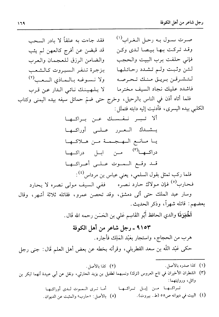 9153 - رجل شاعر من أهل الكوفة هرب من الحجاج واستجار بعبد الملك فأجاره حكى عبد الله بن سعد القطربلي وقرأته بخطه عن بعض أهل العلم قال جنى رجل