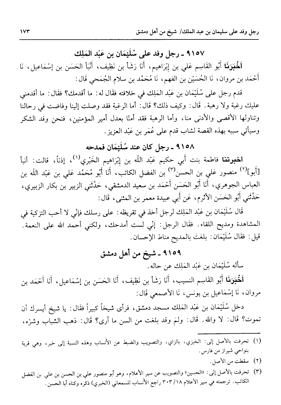 9157 - رجل وفد على سليمان بن عبد الملك أخبرنا أبو القاسم علي بن إبراهيم أنا رشأ بن نظيف أنبأ الحسن بن إسماعيل نا أحمد بن مروان نا الحسين بن الفهم نا محمد بن سلام الجمحي قال قدم رجل على سليمان بن عبد الملك في خلافته فقال له ما اقدمك فقال ما أقدمني عليك رغبة ولا رهبة قال وكيف ذلك قال اما الرغبة فقد وصلت إلينا وفاضت في رحالنا وتناولها الأقصى والأدنى منا وأما الرهبة فقد أمنا بعدل أمير المؤمنين فنحن وفد الشكر وسيأتي سببه بهذه القصة لشاب قدم على عمر بن عبد العزيز
