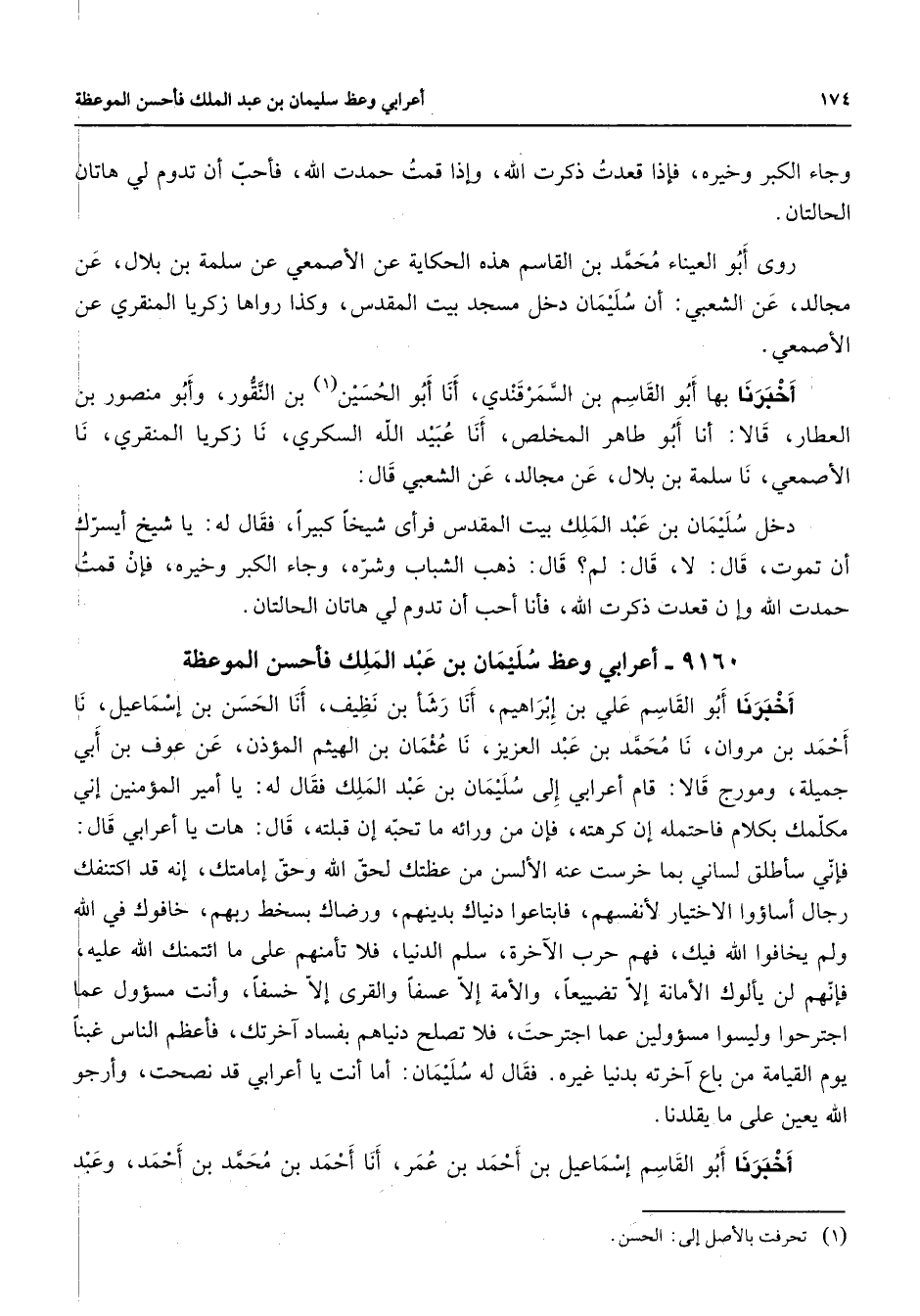 وجاء الكبر وخيره فإذا قعدت ذكرت الله وإذا قمت حمدت الله فأحب أن تدوم لي هاتان الحالتان روى أبو العيناء محمد بن القاسم هذه الحكاية عن الأصمعي عن سلمة بن بلال عن مجالد عن الشعبي أن سليمان دخل مسجد بيت المقدس وكذا رواها زكريا المنقري عن الأصمعي أخبرنا بها أبو القاسم بن السمرقندي أنا أبو الحسين (1) بن النقور وأبو منصور بن العطار قالا أنا أبو طاهر المخلص أنا عبيد الله السكري نا زكريا المنقري نا الأصمعي نا سلمة بن بلال عن مجالد عن الشعبي قال دخل سليمان بن عبد الملك بيت المقدس فرأى شيخا كبيرا فقال له يا شيخ أيسرك أن تموت قال لا قال لم قال ذهب الشباب وشره وجاء الكبر وخيره فإن قمت حمدت الله وإن قعدت ذكرت الله فأنا أحب أن تدوم لي هاتان الحالتان
